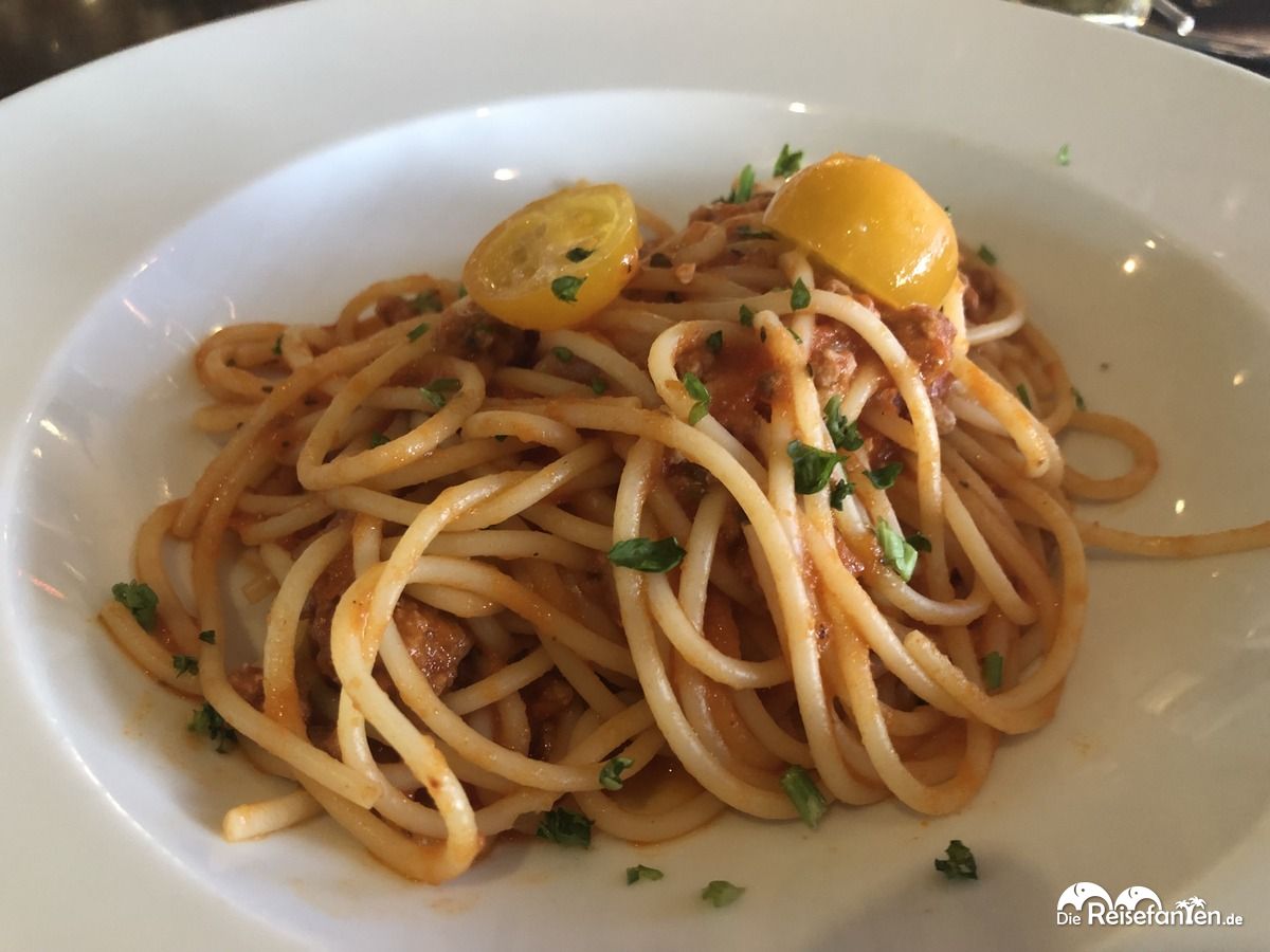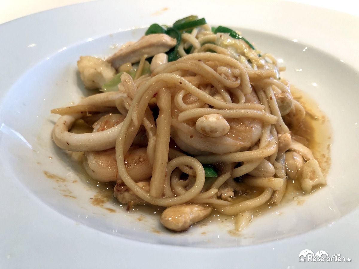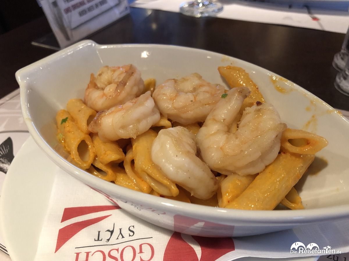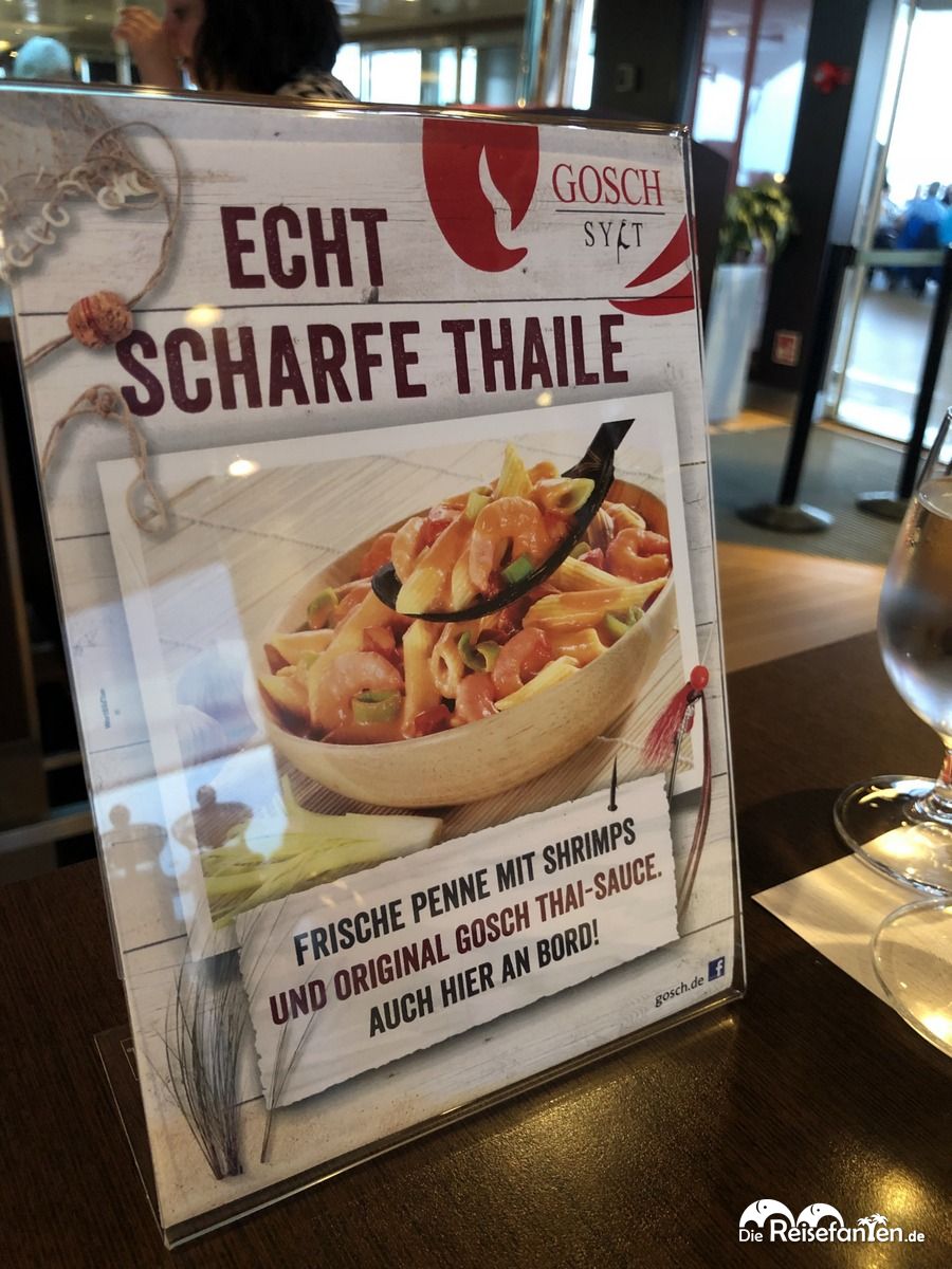 Ja, auch eine Filiale von GOSCH Sylt befand sich an Bord der Mein Schiff 2 und wir aßen dort auch einmal zu Abend. Die klassischen Thai Penne von GOSCH wurden ordentlich beworben, allerdings unterschied sich der Teller dann schon etwas von dem Werbeaufsteller auf unserem Tisch. Geschmacklich traf es aber das Original vom Land.