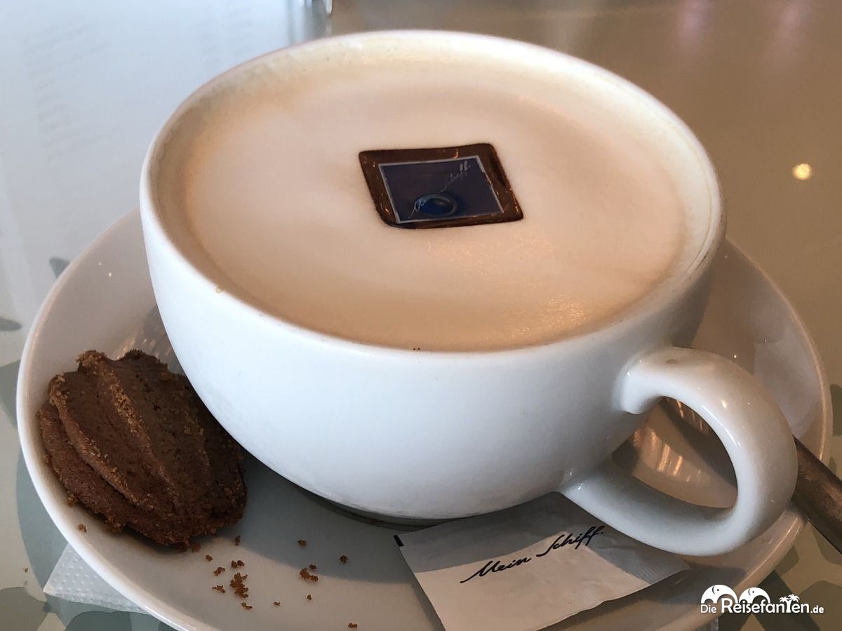 Zum Abschluss noch ein paar Worte zu Kaffee und Getränken: an Bord des Schiffes gibt es diverse Bars, wo es auch noch bis spät in die Nacht leckere Kaffeespezialitäten (und auch natürlich alkoholische Getränke wie Cocktails oder Longdrinks) gab. Wir bestellten uns hier ein paar Mal Cocktails, einige Likör43 mit Milch-Longdrinks und auch diverse Kaffees. Diese wurden mit Liebe zubereitet und es gab sogar noch ein gebrandetes Schokoplättchen der MeinSchiff-Flotte obendrauf. Ein feines, süßes Detail.