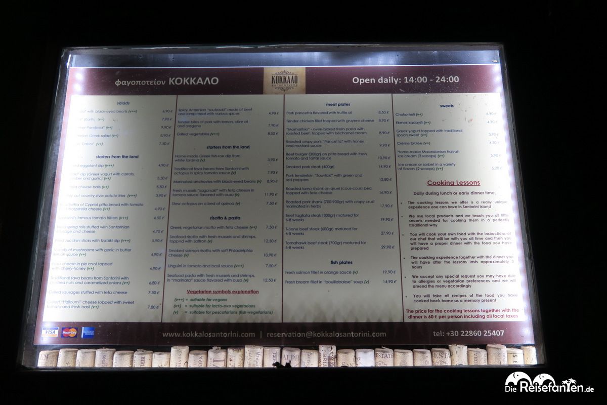 Wie schon zuvor auf Mykonos, so hatten wir auch auf Santorini Glück, dass wir gegen 20h nach einem freien Tisch Ausschau hielten. Auf das Restaurant Kokkalo sind wir sehr spontan gestoßen, so dass für eine Reservierung keine Zeit mehr war aber da wir so früh vor Ort waren, konnte uns die freundliche Bedienung noch einen freien Tisch anbieten.