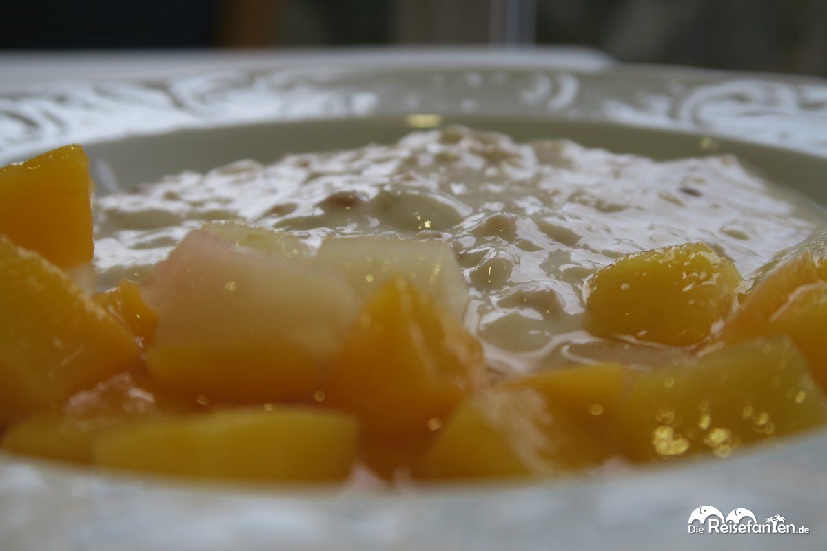 Das Frühstück war zumindest am Samstag sehr lecker, es gab schmackhaftes Rührei und einige Frischkäse- und Süßspeisen-Varianten. Am Sonntag standen leider nur hart- und weichgekochte Eier als Besonderheiten auf dem Frühstücksprogramm, dazu Aufback-Brötchen und teils selbstgemachte Marmeladen, die allerdings nicht mehr nachgefüllt wurden. Zudem war die Atmosphäre eher seminar-ähnlich, also entsprach eher einer Kantine als einem Wohlfühl-Wellness-Hotel im Wald. Immerhin entschädigten die großen Fensterfronten mit einem schönen Ausblick auf die umliegende Natur.