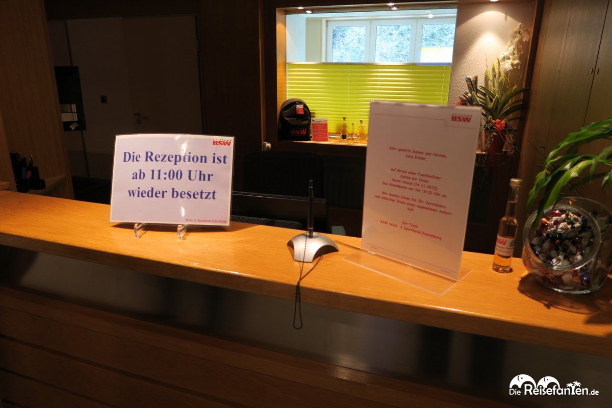 Beim Check-In im Wald- und Sporthotel Festenburg, das übrigens von der Stiftung Bahn-Sozialwerk betrieben wird, gab es dann schon die erste Überraschung. Nicht nur, dass die Rezeption nicht mehr besetzt war (uns sagte man dies bereits vorab am Telefon, als wir auf unsere etwas spätere Ankunft um 20 Uhr hinwiesen) und wir ins Restaurant mussten, nein, es war im Haupthaus kein Zimmer mehr für uns frei und wir mussten in ein gut 200 Meter entferntes Nebenhaus, in dem sich aber nur Ferienwohnungen befanden. Für große Familien mit Kindern und Hunden (dafür schien es auch explizit geeignet zu sein) sicherlich eine feine Sache, wir hatten uns für unser Wellness-Wochenende aber etwas anderes vorgestellt. Zum Glück konnten wir am nächsten Morgen das Zimmer noch tauschen. Die Mitarbeiter waren hier wirklich sehr bemüht und es hat somit auch alles geklappt. Das neuerliche Umziehen hätte aber nicht sein müssen.
