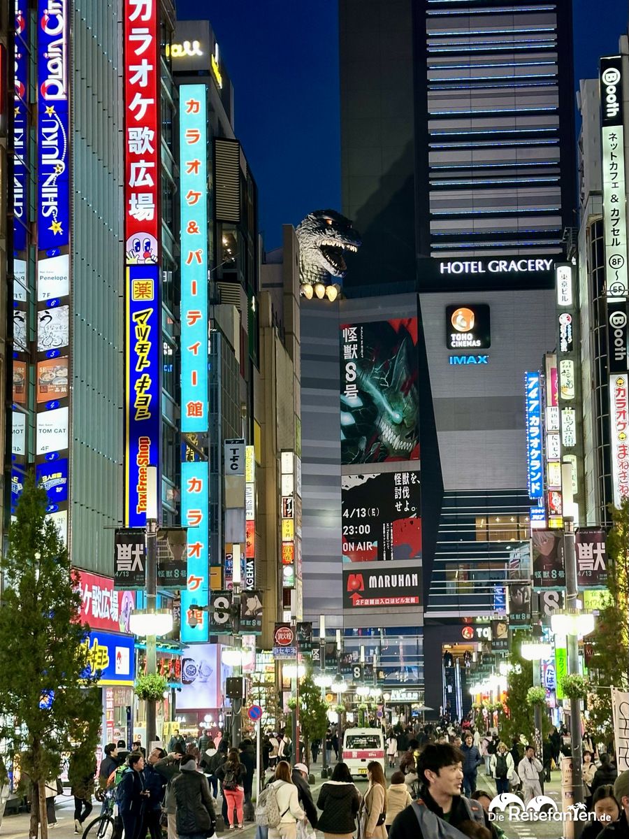 Neben zahlreichen Einkaufs- und Restaurantoptionen gibt es in Shinjuku auch noch eine große Godzilla Skulptur, beziehungsweise Godzillas Kopf in Originalgröße. Die Godzilla Filme kennt ihr sicherlich und da es eine Verbindung zu Tokyo gibt, gehört hier natürlich auch in irgendeiner Form eine Skulptur hin. Der Kopf befindet sich auf einem Dach und ist dann irgendwie doch etwas kleiner als von uns erwartet. Die Godzilla Road führt direkt zur Skulptur, die man auch schon aus der Ferne sehen kann.