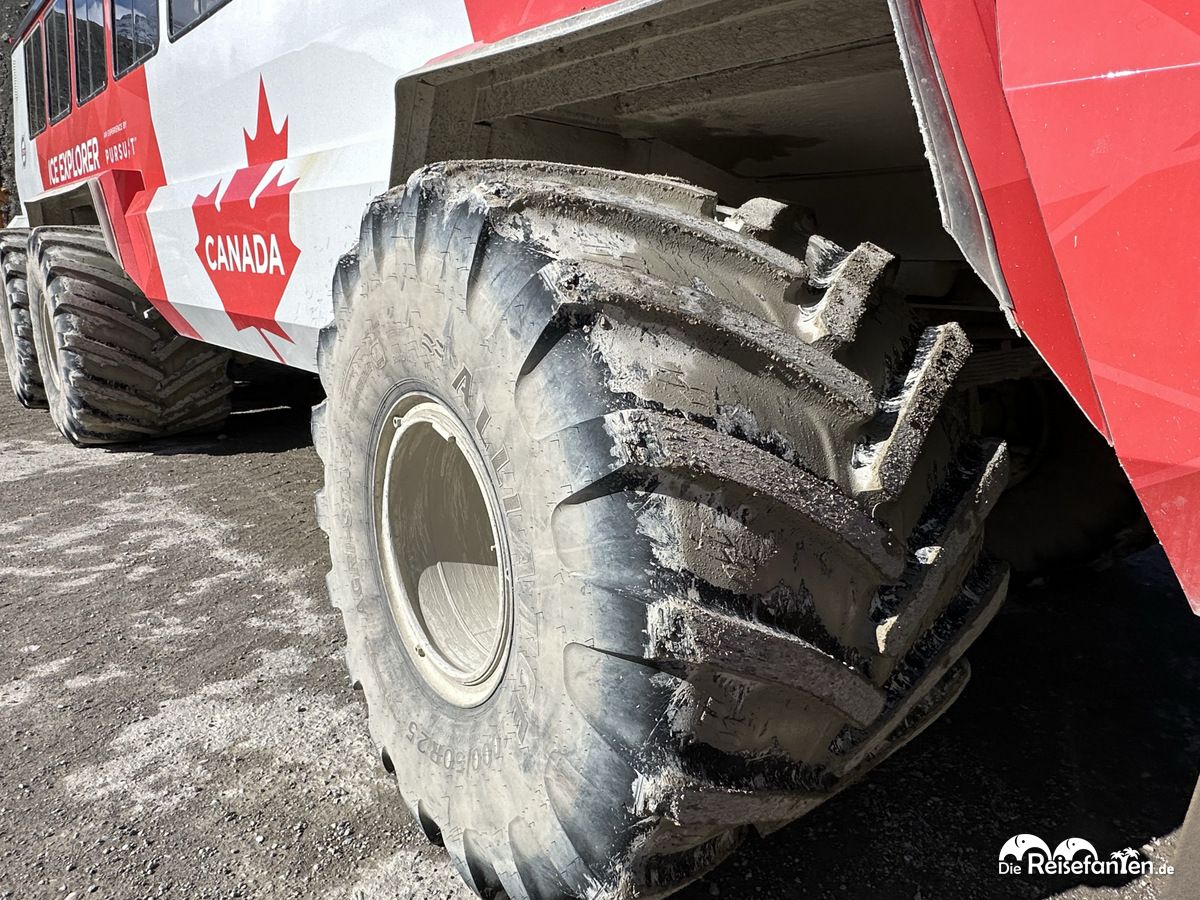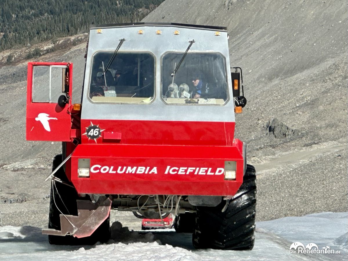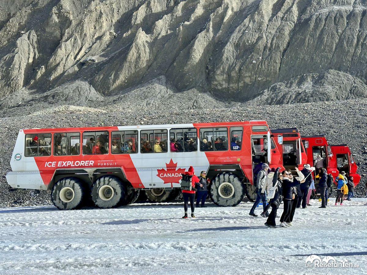Der Andrang auf die Touren war groß und so war vor Ort alles bestens organisiert. Die Touren wurden nach und nach zu den Bussen geführt. Fünf Minuten dauerte die erste Fahrt mit einem normalen Reisebus. Dann stiegen wir in ein Gletscherfahrzeug um und fuhren in 15 Minuten zum Gletscher. Dabei mussten wir eine 32%ige Steigung überwinden. Man hatte teilweise das Gefühl, man überschlägt sich mit dem Fahrzeug aber das war natürlich nicht der Fall. Eine imposante Fahrt war das! Währenddessen erfuhren wir allerhand wissenswertes über den Gletscher. So besteht das Columbia Icefield insgesamt aus 6 Gletschern, die über 8000 Jahre als sind.
