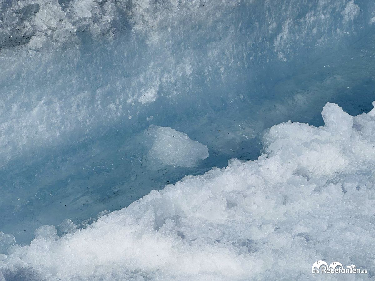 Wir erreichten schließlich unser Ziel und standen direkt auf dem Gletschereis! Rund 115m dick war das Eis an der Stelle. Das Areal wird täglich inspiziert und der zugängliche Bereich war entsprechend abgesteckt. 30 Minuten hatten wir Zeit uns hier umzusehen. Es war recht frisch und wir waren froh, uns warm genug angezogen zu haben. Zudem hatten wir mit dem Wetter großes Glück, es war schön sonnig aber dadurch war es auf dem Eis auch sehr hell. Wenn man mit dem Schuhen etwas loses Eis wegwischte, sag man darunter festes Eis, welches Blau schimmerte. Ansonsten war aufgrund der enormen Helligkeit wenig zu erkennen.