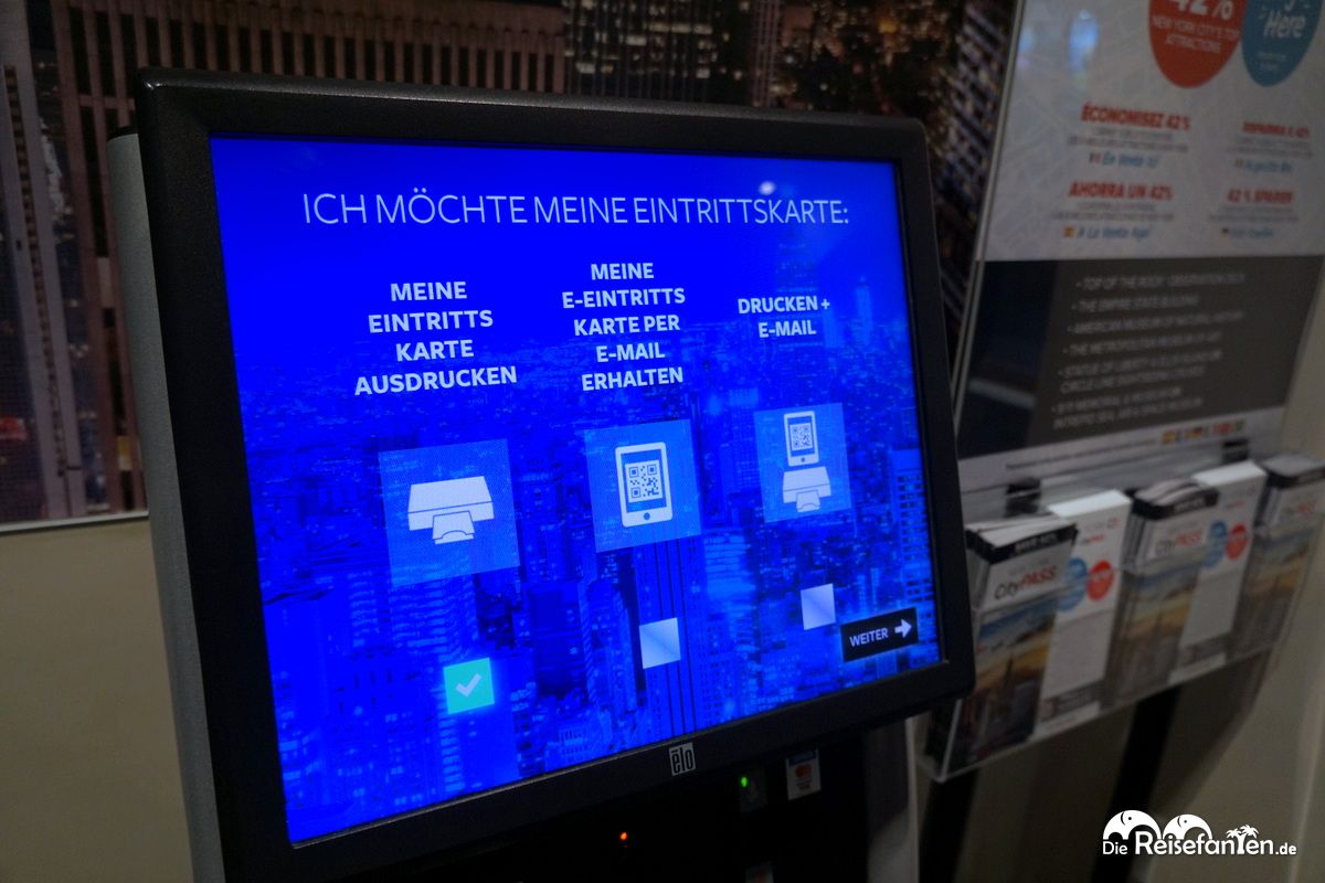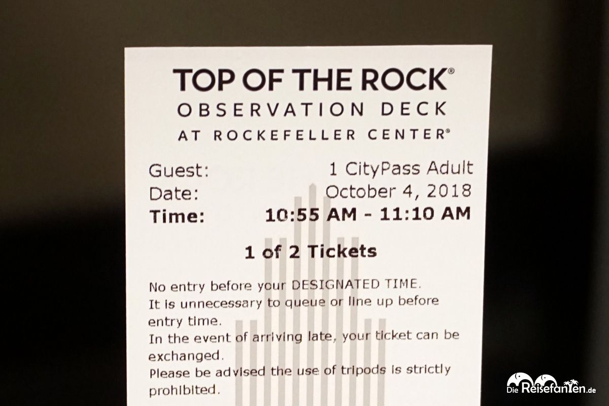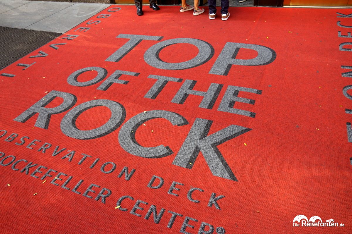 Der Einlass verläuft typisch amerikanisch und gut organisiert. Zunächst schreitet man über den roten Teppich ins Gebäude, vorbei an zig Infotafeln, die einstimmen. Dann geht es zum Ticketdrucker, wo die persönlichen Tickets ausgedruckt werden können (wir hatten den New York City Pass und konnten damit ein Ticket einlösen). Die Besuchszeiten sind fest geregelt, wer vorher erscheint, bekommen keinen Zutritt, auch wenn es leer sein sollte. Alles streng organisiert. Nach der obligatorischen Tascheninspektion geht es dann hoch auf das Dach des Rockefeller Centers.