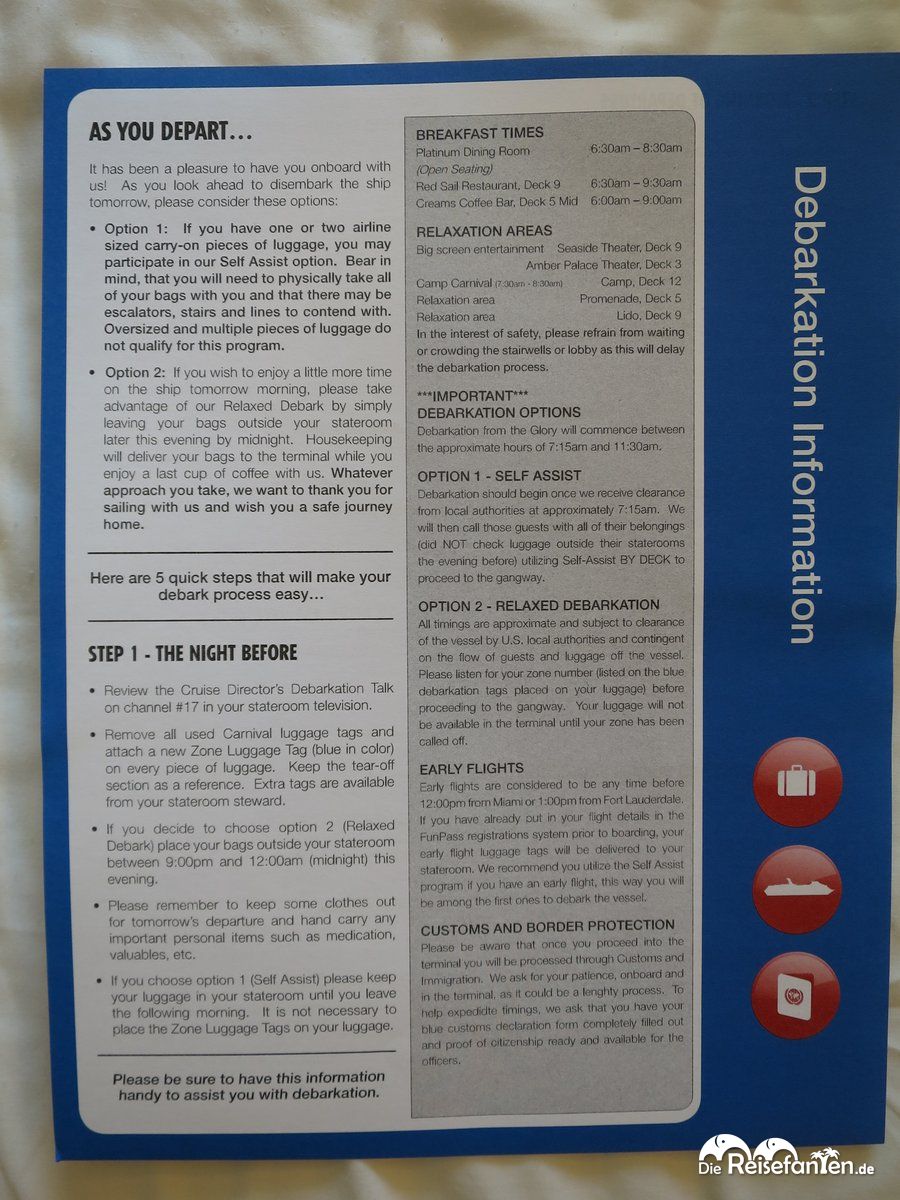 An unserem letzten Tag an Bord der Carnival Glory wurden alle Kreuzfahrtpassagiere über das Ausschiffen am nächsten Morgen im Zielhafen Miami informiert. Das Ausschiffen wurde auf einen Zeitraum von 07:15 – 11:30 Uhr festgelegt und da es unsere erste Kreuzfahrt war, waren wir natürlich entsprechend gespannt, wie dieser Prozess ablaufen wird.