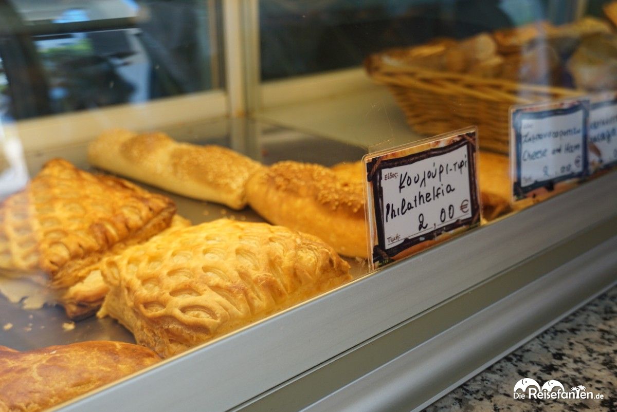 Wir waren während unserer Zeit mehrmals in der Bäckerei in Therma, die wie so viele lokale Einrichtungen nur einen griechischen Name angeschlagen hat. Zur besseren Orientierung haben wir aber natürlich ein Foto gemacht. 🙂 Einheimische und Touristen gehören gleichermaßen zu den Kunden. Ein wenig Englisch wird gesprochen und die Produkte bestmöglich erklärt.