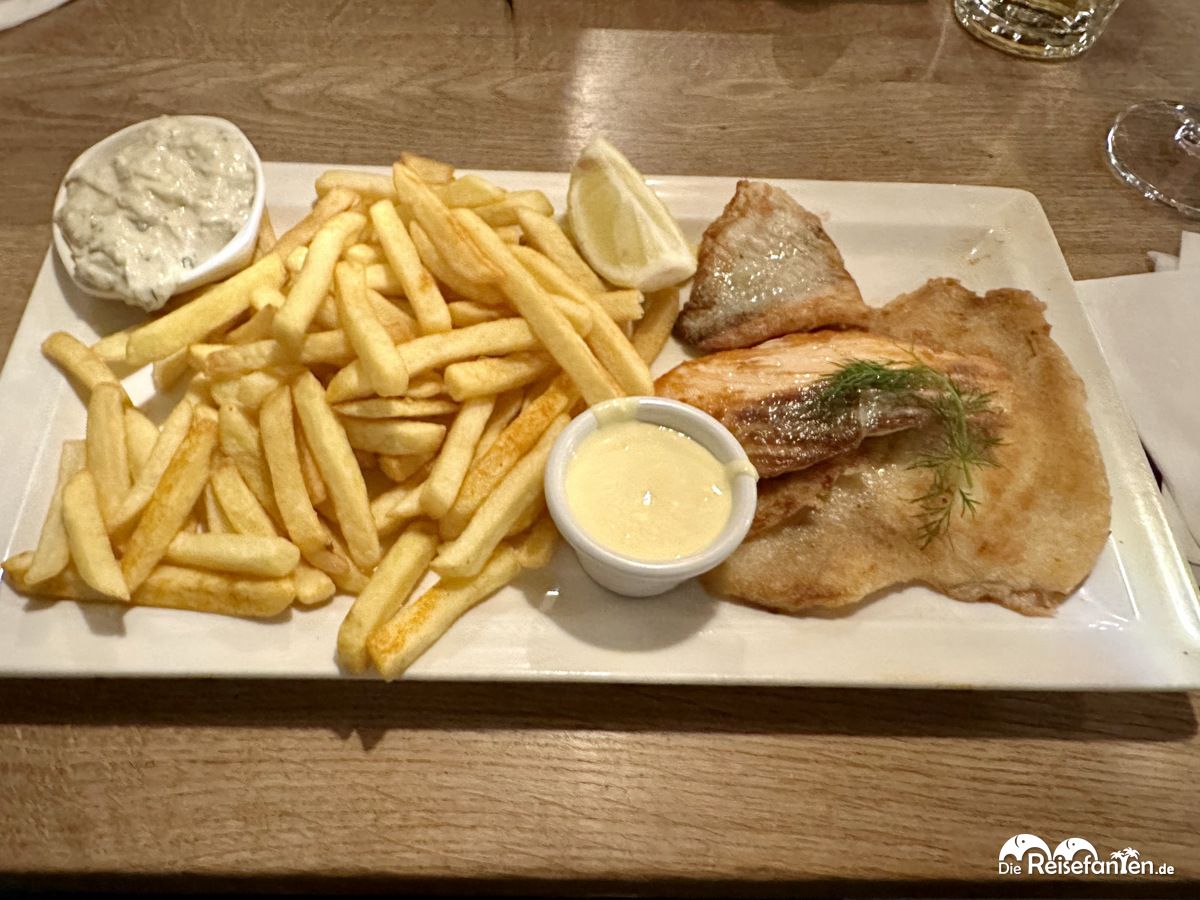Auf der Karte gibt es allerlei aus dem Meer, sowie einige wenige Gerichte ohne Fischanteil. Die angepasste Mehrwertsteuer im Gastrobereich ist leider auch bei Gosch bemerkbar, so sind die Preise seit Jahresbeginn nochmal merklich angepasst worden. Die Qualität war aber erneut sehr gut und die Gerichte wurden nach erfolgter Bestellung frisch zubereitet. Wir hatten einen Edelfischteller mit einer sehr großzügigen Menge an Pommes. Auch waren die Fischstücke reell groß. Dazu die Spaghetti mit Lachs, die auch eine sehr große Portionsgröße hatte. Geschmacklich zudem sehr lecker. Mit zwei Getränken waren wir aber nahezu 60 EUR los – kann man mal machen und der Qualität auch sicherlich angemessen, wer auf seinen Geldbeutel achten muss, der wird sich bei Gosch aber wohl nicht wiederfinden.
