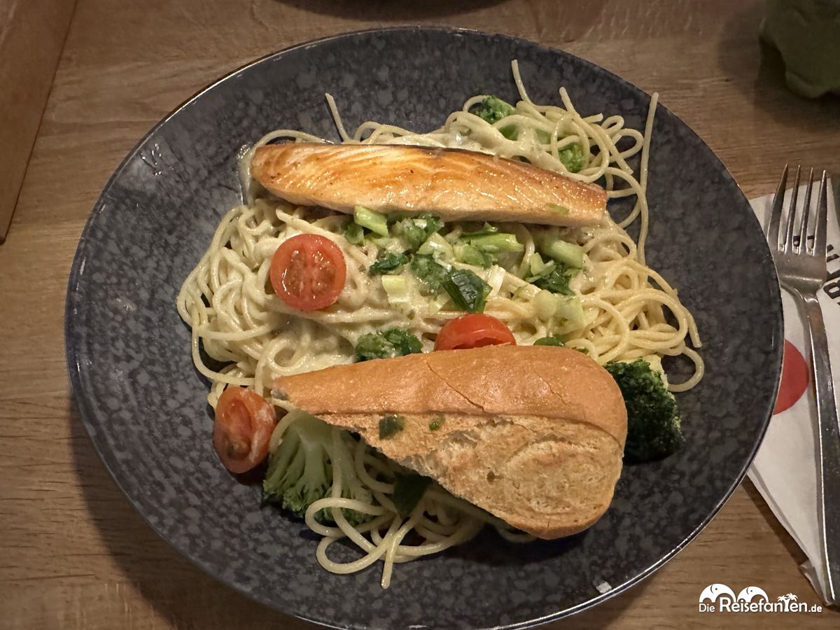 Auf der Karte gibt es allerlei aus dem Meer, sowie einige wenige Gerichte ohne Fischanteil. Die angepasste Mehrwertsteuer im Gastrobereich ist leider auch bei Gosch bemerkbar, so sind die Preise seit Jahresbeginn nochmal merklich angepasst worden. Die Qualität war aber erneut sehr gut und die Gerichte wurden nach erfolgter Bestellung frisch zubereitet. Wir hatten einen Edelfischteller mit einer sehr großzügigen Menge an Pommes. Auch waren die Fischstücke reell groß. Dazu die Spaghetti mit Lachs, die auch eine sehr große Portionsgröße hatte. Geschmacklich zudem sehr lecker. Mit zwei Getränken waren wir aber nahezu 60 EUR los – kann man mal machen und der Qualität auch sicherlich angemessen, wer auf seinen Geldbeutel achten muss, der wird sich bei Gosch aber wohl nicht wiederfinden.