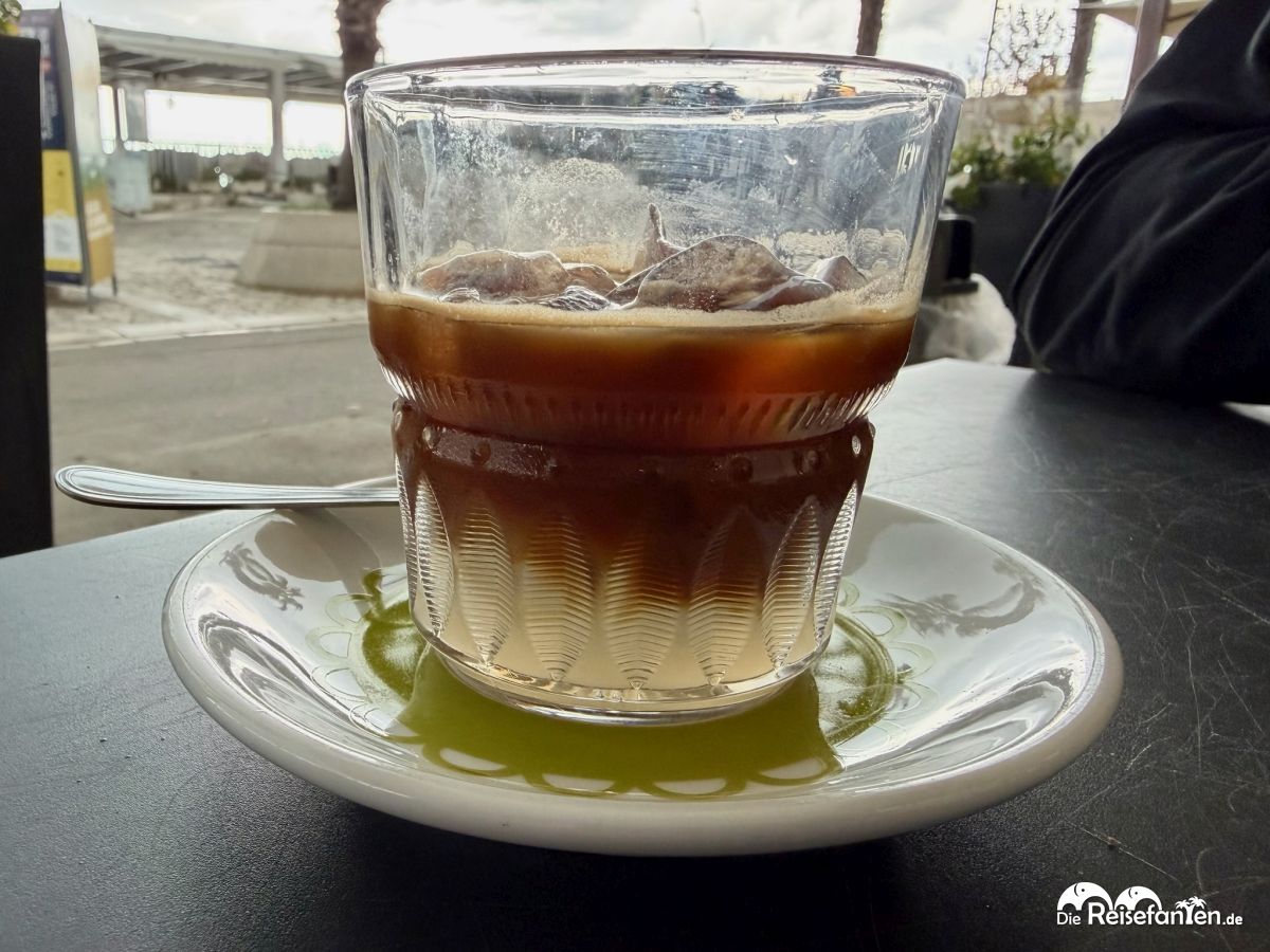 Bei Martinucci oder kleinen Bars bestellten wir ihn immer wieder – in einem Glas mit Schichten: Unten Mandelmilch, dann Eiswürfen, dann Espresso oben drauf. Der erste Schluck war wie ein Weckruf: Bitter-süß, cremig, mit Mandelaroma, das ein wenig an Orangenblüten und auf jeden Fall an Amaretto erinnert. Selbst Ende September, bei deutlich weniger als 30 Grad, war das immer noch unser täglicher Ritual.