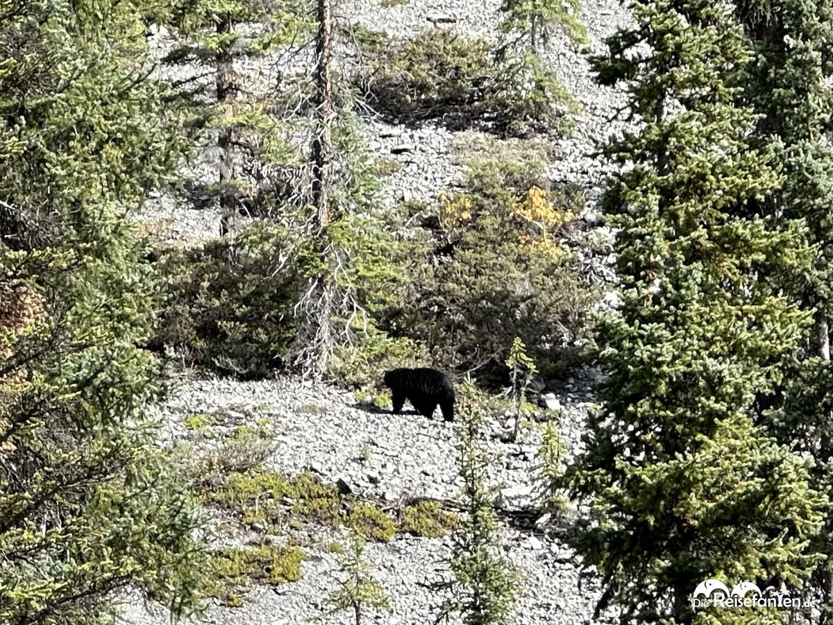 Kurz darauf hielten am Straßenrand einige Autos – wir fragten uns daher, was gesehen da wohl los sei. Da wir dies zunächst nicht herausfinden konnten, hielten wir ebenfalls und fanden schnell die passende Antwort – ein Schwarzbär war am Berghang auf Futtersuche. Der Bär war weit genug entfernt, so dass viele Touristen das Treiben aus der Ferne ansahen.