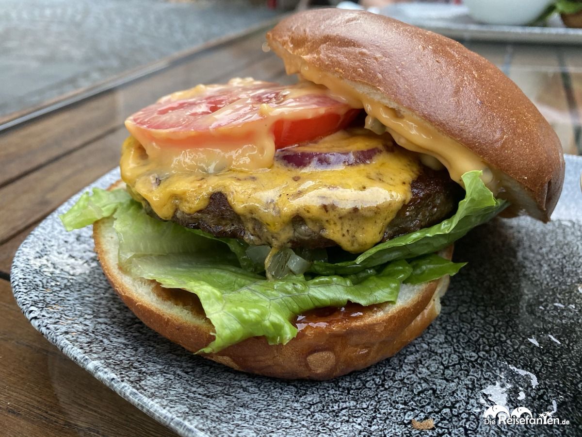 Unseren Tisch bekamen wir schnell zugewiesen und unsere Getränkewünsche wurden prompt entgegen genommen. In Zeiten von Corona bietet das Anno 1865 im Reethus nur eine reduzierte Karte an, wobei uns der Burger direkt ansprach. Zusammen mit einer großen Portion Pommes wurde er serviert. Die Nachfrage, wie wir den Burger am liebsten gebraten hätten, wäre bei der Bestellaufnahme noch angebracht gewesen, kam aber nicht.