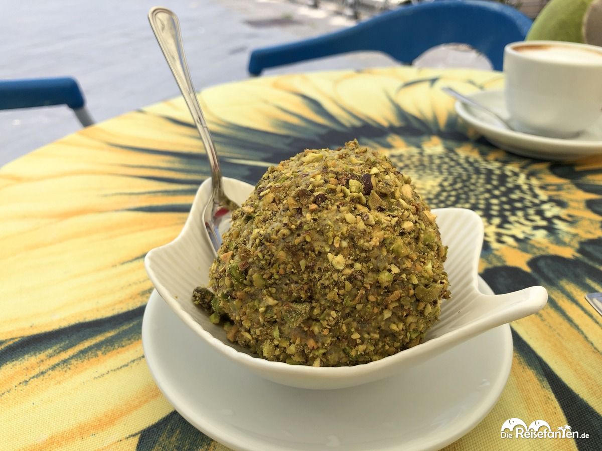Das klassische Tartufo Eis besteht aus Nuss- und Schokoladeneis, ist mit Schokoladensauce gefüllt und mit Kakao ummantelt. Das Eis sieht aus wie ein Ball und ist einer Trüffelpraline nachempfunden. Daher auch der Name Tartufo, was Trüffel bedeutet. Mittlerweile gibt es aber unzählige Varianten des Tartufo Eis und zu unserer Freude auch eine aus Pistazieneis mit Pistazienkernen.