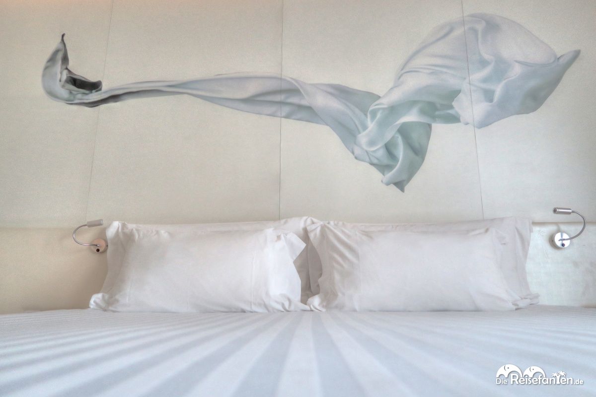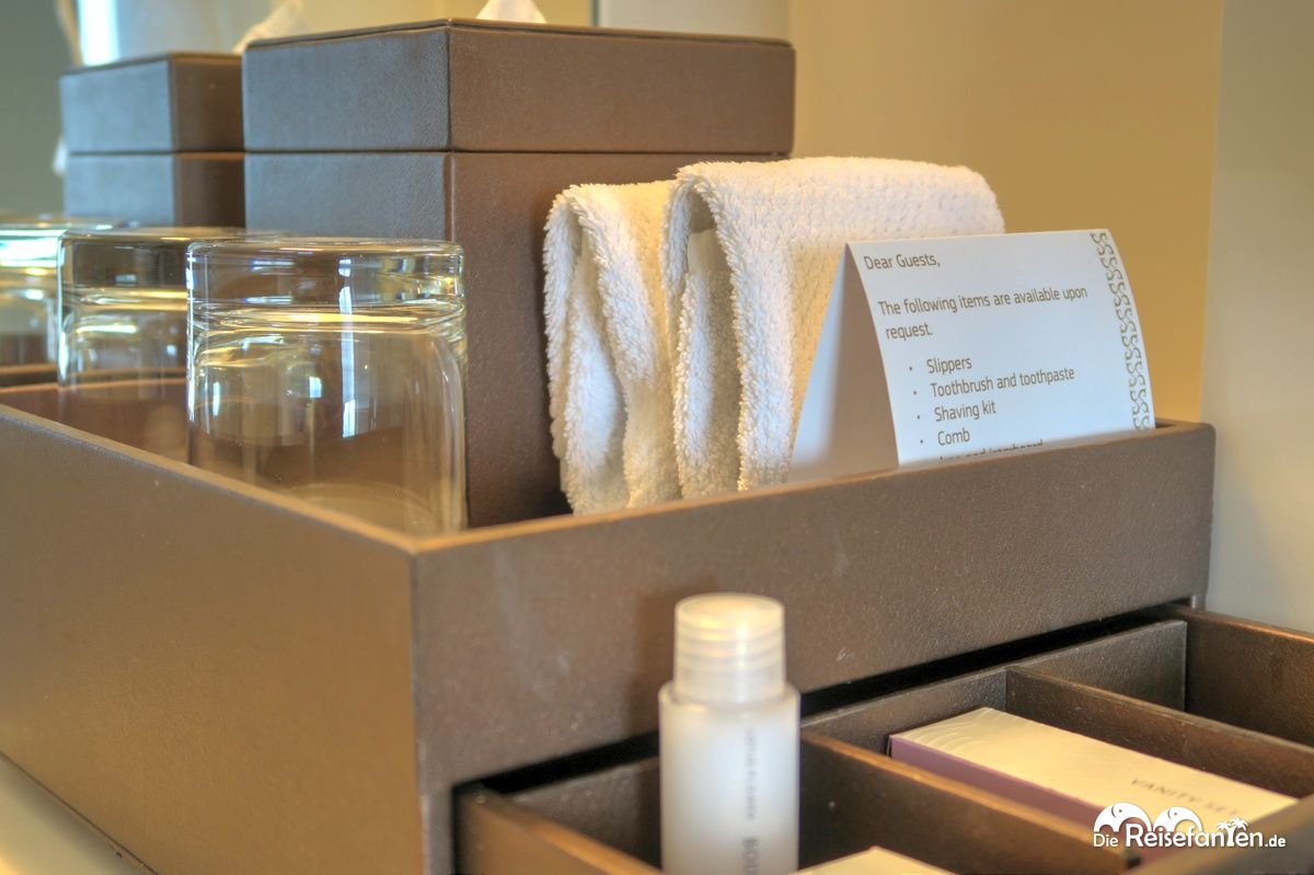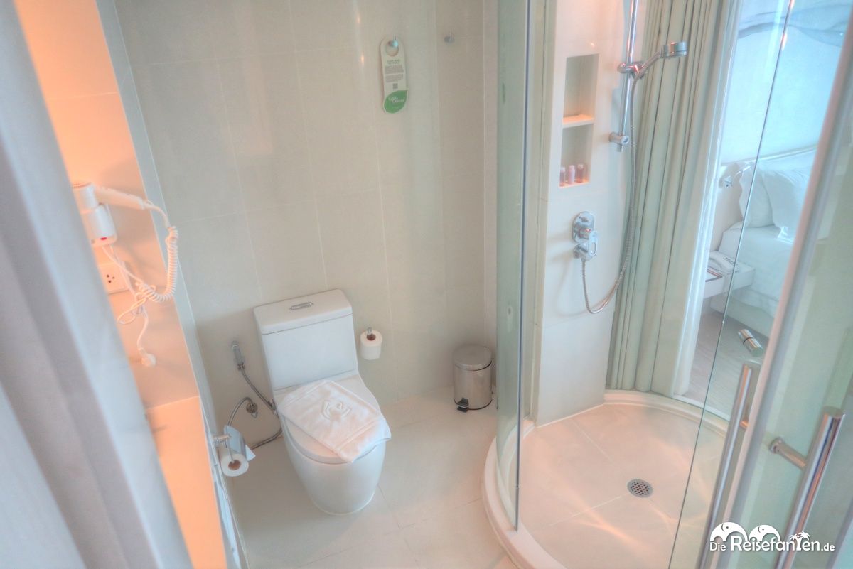 Im Zimmer angekommen fiel uns gleich auf, dass sich das freundliche, helle Interieur auch hier fortsetzt. Viel Weiß, alles sauber und alles in modernem Design. Eine Besonderheit: die Dusche befindet sich praktisch im Zimmer. Wer also den Vorhang aufzieht, kann beim Duschen in den Schlafbereich schauen. Wer auch noch die Fenstervorhänge aufzieht, kann theoretisch noch weiter schauen und sich dabei dem Wasser hingeben. Diese Einrichtung fanden wir auf jeden Fall gut, zudem hatten wir in der runden Duschkabine ausreichend Platz.