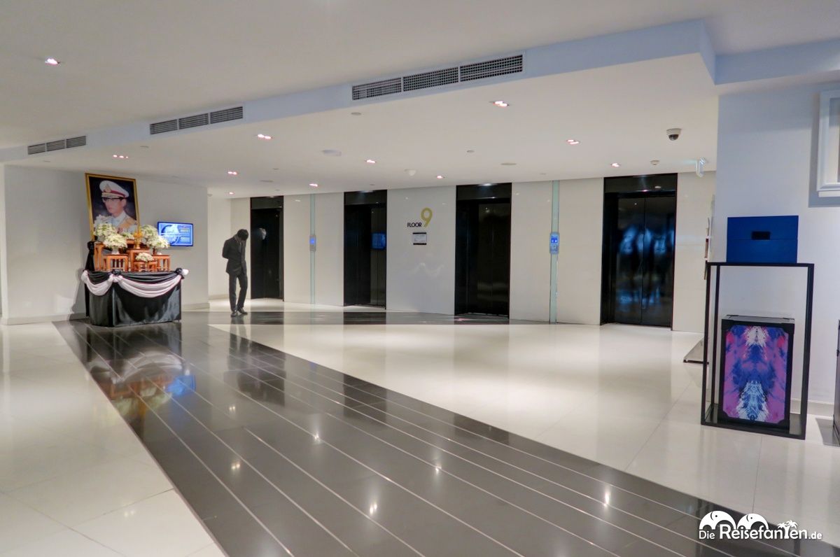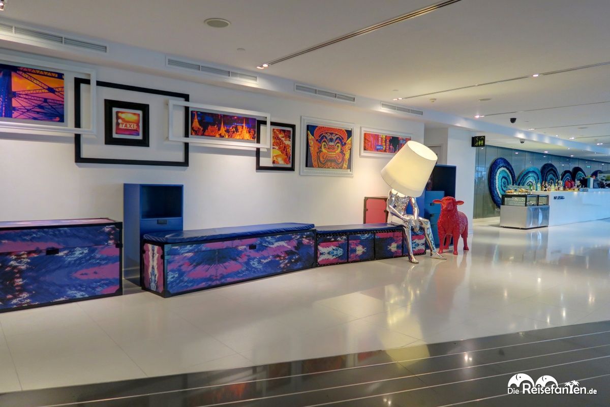 Unseren Aufenthalt im Centara Watergate Pavillion Hotel Bangkok begingen wir wie jeder Hotelgast – in der Lobby. In diesem schönen, großzügig gestalteten Bereich des Hotels gibt es viele Sitzmöglichkeiten und wir wurden zudem mit einer landestypischen Spezialität in Form eines Safts begrüßt, den wir bei den Temperaturen gerne annahmen. Es dauerte ein paar Minuten, bis man unser Zimmer soweit hatte (wir reisten flugbedingt deutlich früher an als die regulären Check-In-Zeiten), aber auch das klappte alles hervorragend und wurde von dem sehr freundlichen Personal sehr zuvorkommend abgewickelt. Das gefiel uns schon mal sehr und wir hatten noch ausreichend Zeit, das „Lampenmännchen“ in der Lobby zu begutachten.