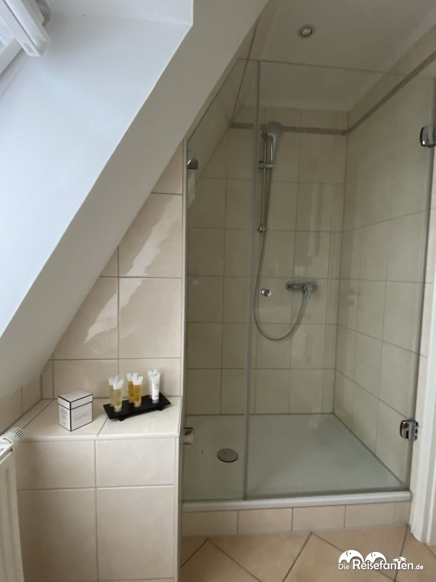 Unser Doppelzimmer wurde uns persönlich gezeigt und man nahm uns bei der Gelegenheit gleich einen Teil unseres Gepäcks ab. Unser Zimmer befand sich in der zweiten Etage, einen Fahrstuhl gab es nicht. Wer nicht ganz so gut zu Fuß ist, wählt besser ein Zimmer in den unteren Etagen. Da es sehr warm war, war auch unser Zimmer gut aufgeheizt. Zum Abend ließ es sich aber recht gut lüften. Ein Kühlschrank fehlte uns bei den Temperaturen vielmehr. Im Zimmer stand täglich eine Wasserflasche zur Verfügung und auch Kaffee und Tee hätte man sich zubereiten können. Das Badezimmer war mit einer Dusche ausgestattet und sehr groß. Auch hier gab es ein Fenster. Am nächsten Morgen wollten wir eigentlich ein ‚Bitte nicht stören Schild‘ an die Tür hängen, denn eine Reinigung wäre nicht nötig gewesen, allerdings war kein Schild zu finden.