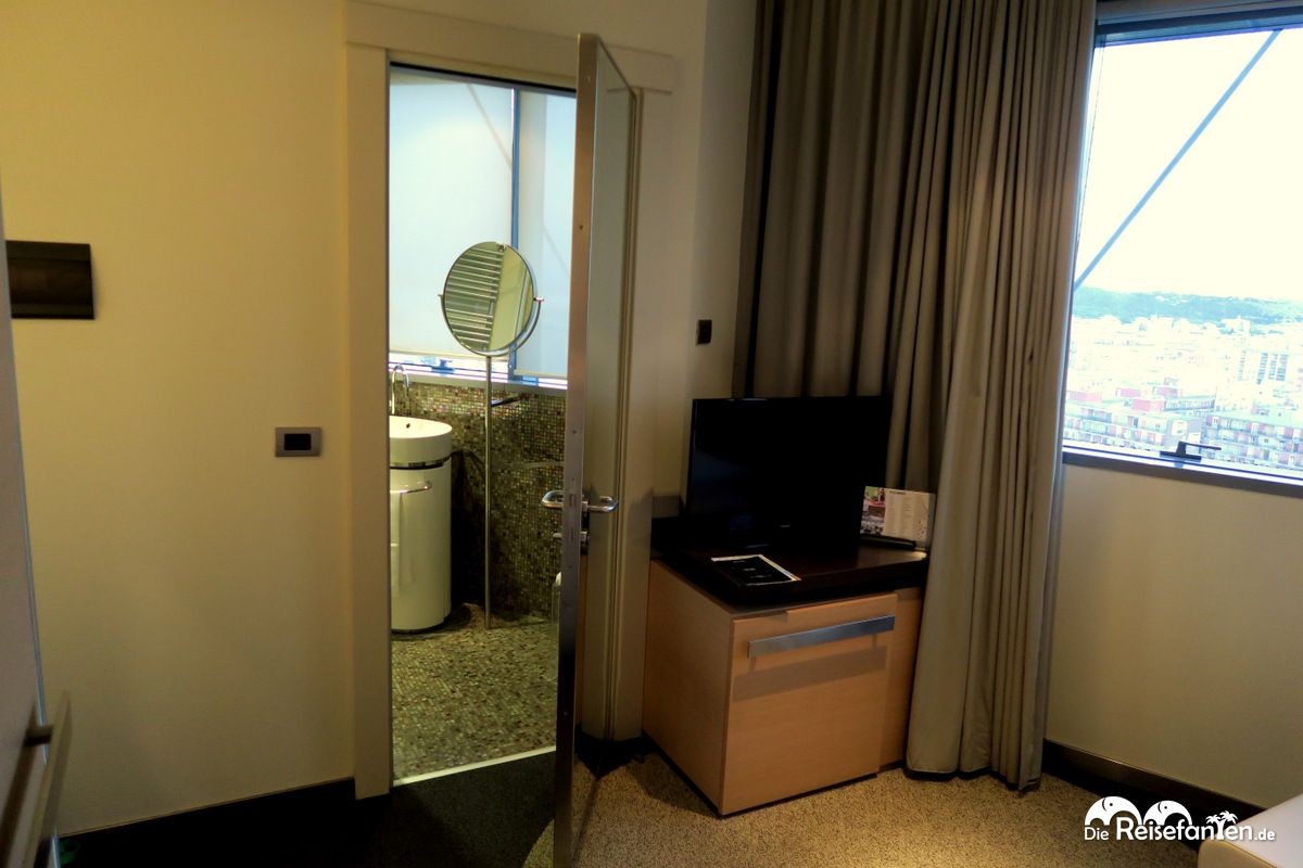 Ein schneller, freundlicher Check-In mit vielen Informationen zum Hotel und zu Cagliari und schon befanden wir uns im Fahrstuhl, der uns in die 14. Etage brachte. Ganz oben, da befand sich unser Zimmer. Bevor wir die Zimmertür öffneten waren wir schon gespannt, welchen Ausblick wir wohl gleich genießen dürfen. Das Geheimnis wurde schnell gelüftet: wir hatten einen super Ausblick über Cagliari und das nicht nur vom Schlafzimmer, sondern auch vom Badezimmer. Unser Zimmer war sehr stylisch und modern eingerichtet inkl. Flachbildfernseher, Safe und Klimaanlage. Die Fenster ließen sich zudem alle öffnen. Das Badezimmer war ebenfalls sehr modern und komplett mit Perlmutt-Mosaik-Fliesen gefliest. Sicherlich Geschmackssache, wir fanden es toll! Eine Eckdusche, ein Bidet, Pflegeprodukte sowie der schon angesprochene Ausblick machten das Badezimmer nahezu perfekt. WLAN steht im kompletten T Hotel kostenlos zur Verfügung.