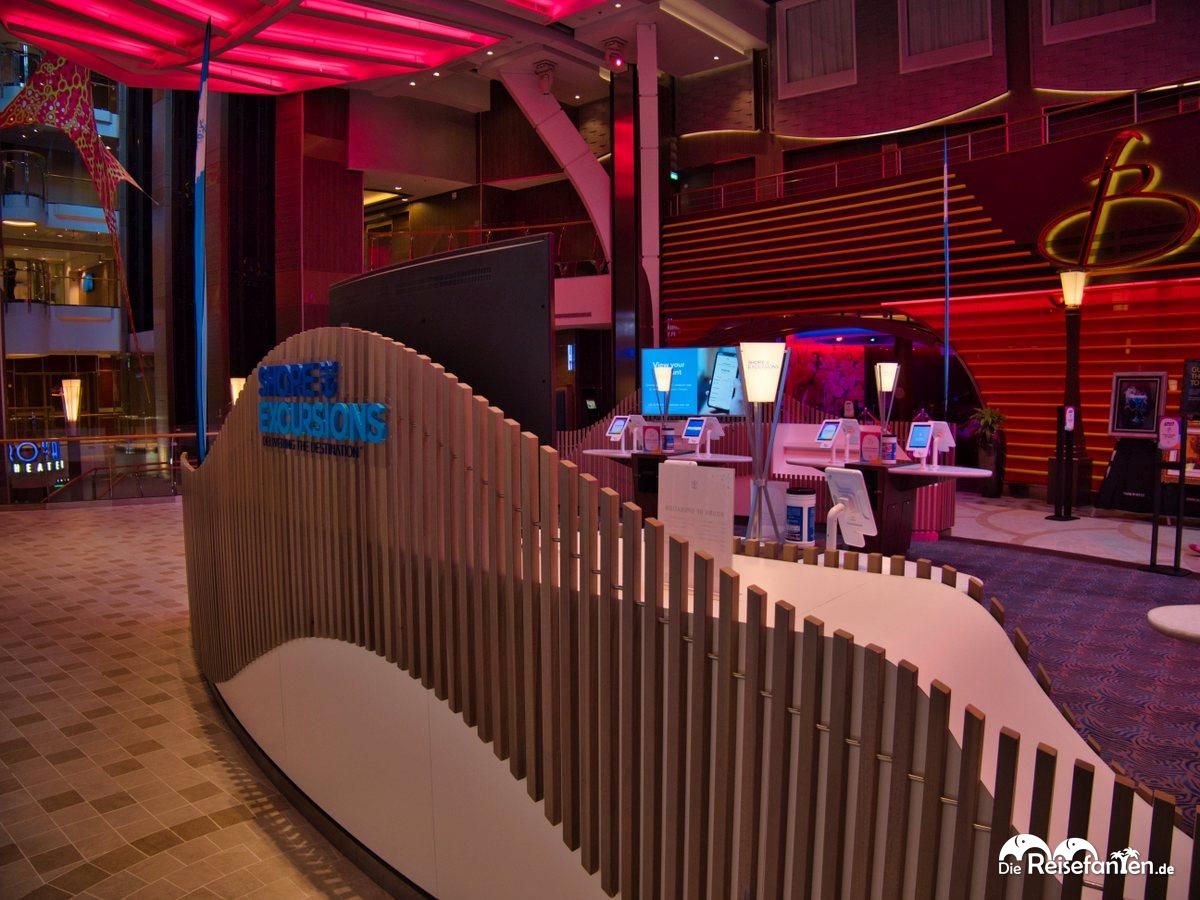 Auf Deck 5 befindet sich ganz vorne am Schiff das Royal Theater, zumindest dessen oberster Teil, da es ja bereits auf Deck 3 anfängt. In der Schiffsmitte befindet sich dann die sogenannte Royal Promenade mit zahlreichen Geschäften und Cafes/Bars. Weiter hinten schließt sich dann schon der Main Dining Room an (ebenfalls auf Deck 3 beginnend). Wir fokussieren uns in diesem Beitrag daher auf die Mitte, der Royal Promenade.