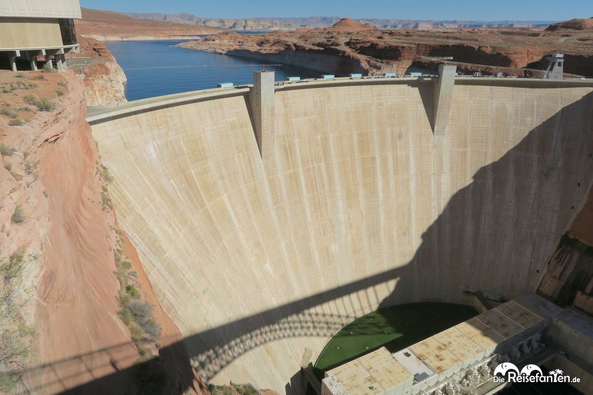 Stolze 216 Meter hoch ist die Staumauer des Glen Canyon Dam und damit eine der höchsten der USA. Jedoch kommt man auf die eigentliche Mauer direkt nur im Rahmen einer Führung rauf, alle anderen Besucher haben jedoch auf der etwas erhöht verlaufenden Brücke dank Löchern im Maschendraht die Gelegenheit, dieses Bauwerk zu bestaunen und zu fotografieren. Das haben wir übrigens auch gemacht.