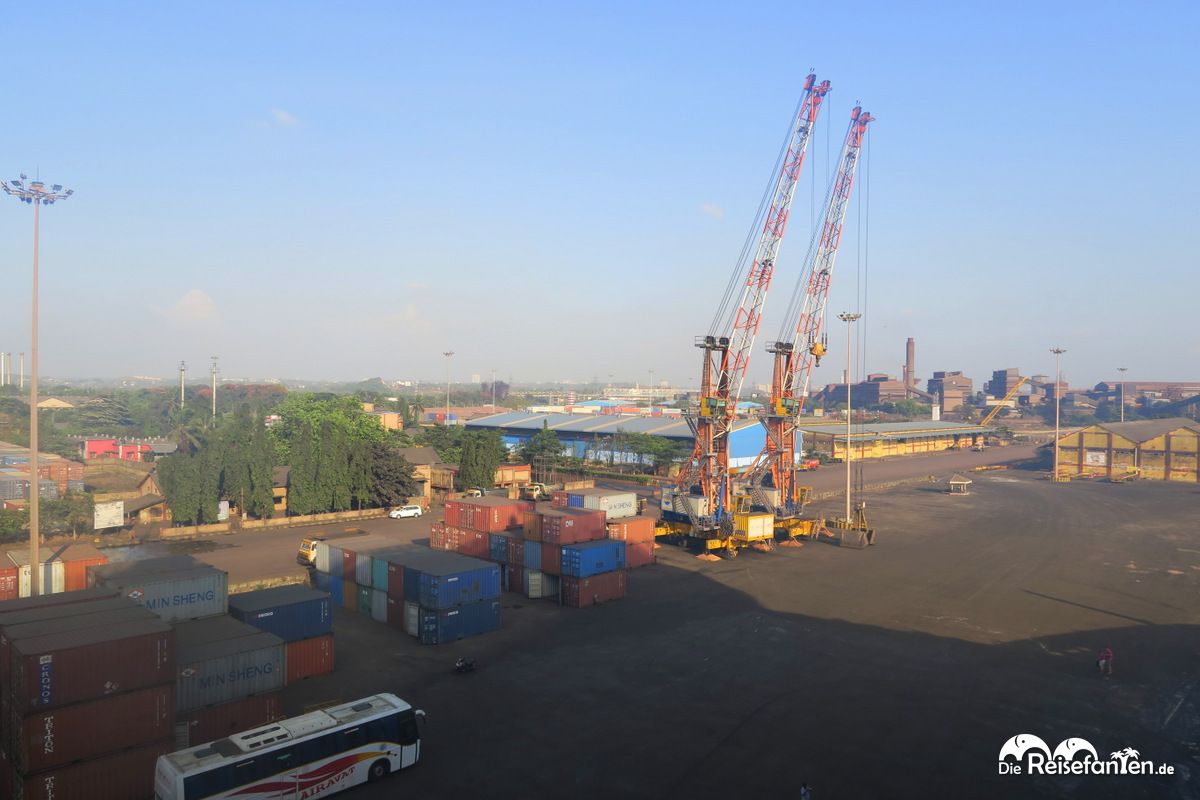 Vor dem Frühstück besorgten wir uns unsere Landgangskarten. Zusammen mit den Reisepasskopien konnten wir dann unseren Landgang antreten. Zunächst mussten wir das weitläufige Hafengelände passieren. Am Ausgang wurden unsere Landgangskarten handschriftlich! erfasst und mit fortlaufenden Nummern versehen. Nicht sonderlich fortschrittlich in der heutigen Zeit und nachdem dies in Cochin nicht erforderlich war, schon etwas sonderbar.