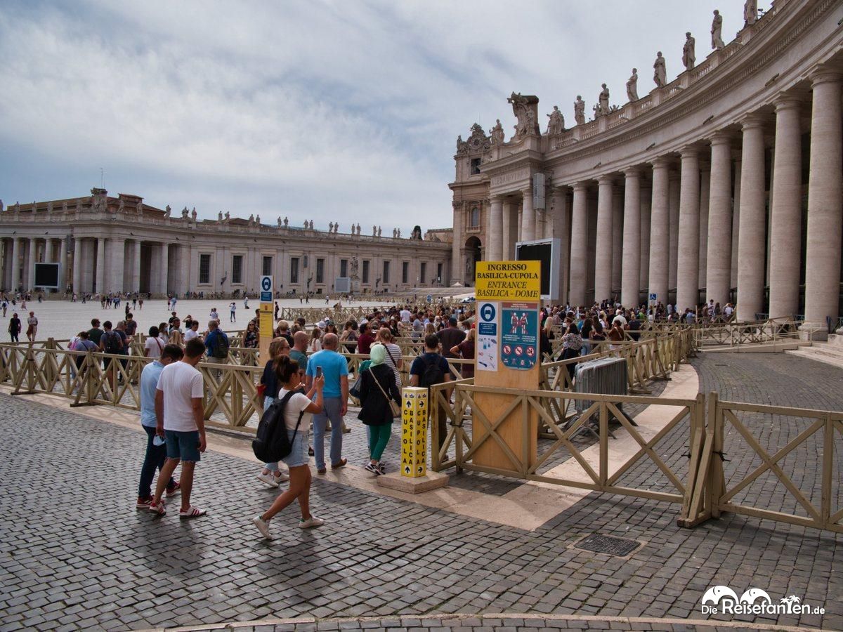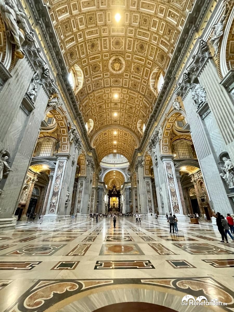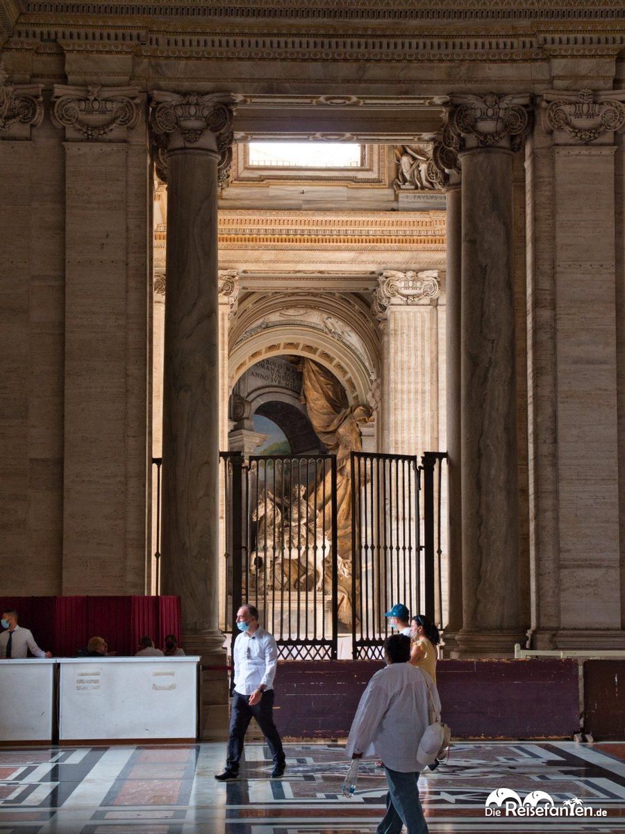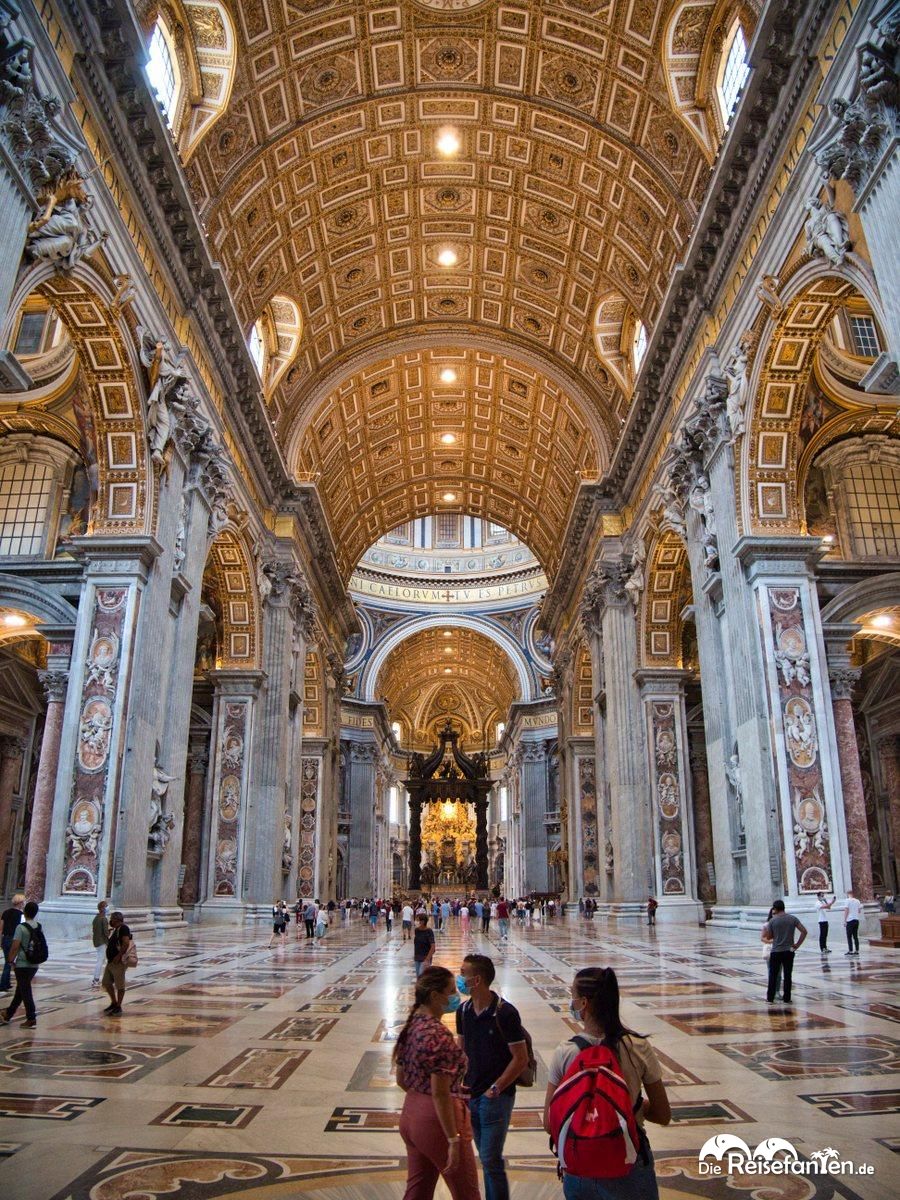 Der Besuch selbst ist kostenlos und es müssen auch keine Eintrittskarten im Voraus gebucht werden, aber dann hat man üblicherweise mit der langen Schlange zu tun, die sich gerne mal spiralförmig auf dem großen Platz verteilt und mehrere Stunden Wartezeit bedeutet. Daher gibt es sogenannte Skip-the-Line-Tickets zu kaufen, mit denen es deutlich schneller geht. Grundsätzlich sollte man sich respektvoll kleiden, im Petersdom aber besonders. 😉 Also besser Schultern und Knie verdecken und Mütze sowie Hut abnehmen, damit die Wachen keinen Grund haben, den Besuch zu verweigern. Leise sprechen im Inneren wäre auch sehr angeraten, aber selbst bei unserem Besuch (mit den wenigen anderen Menschen) gab es schon einen deutlichen Geräuschpegel.