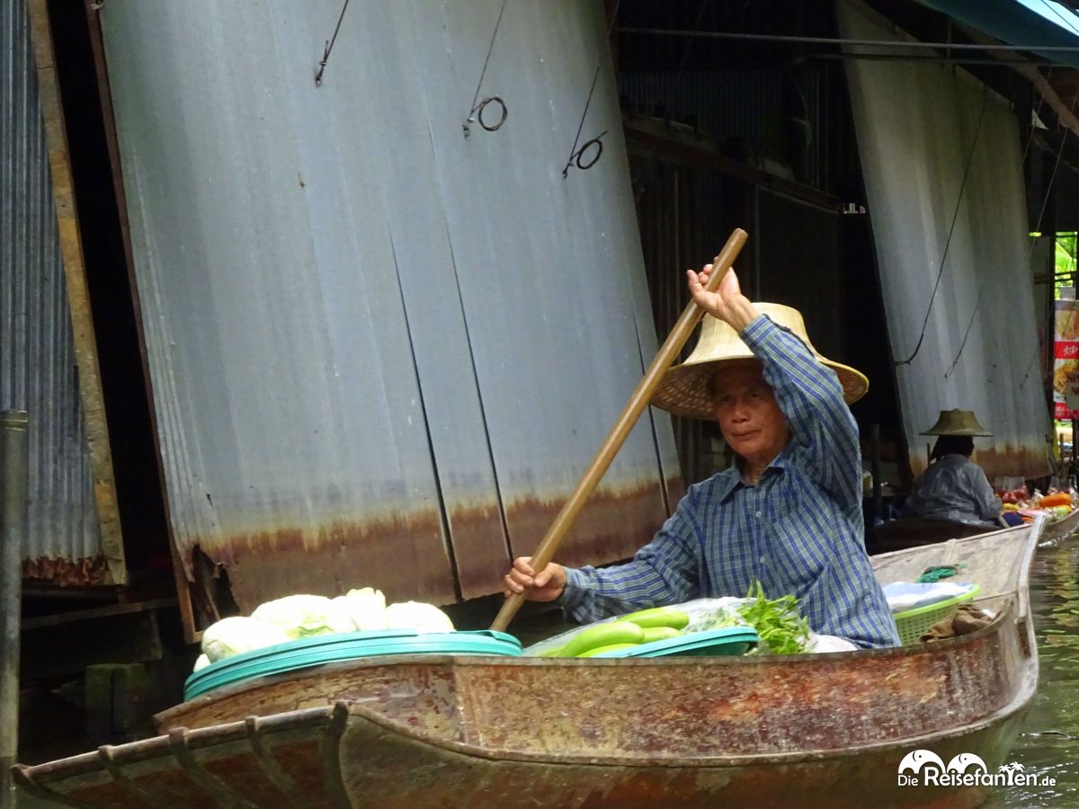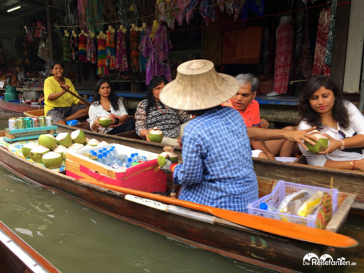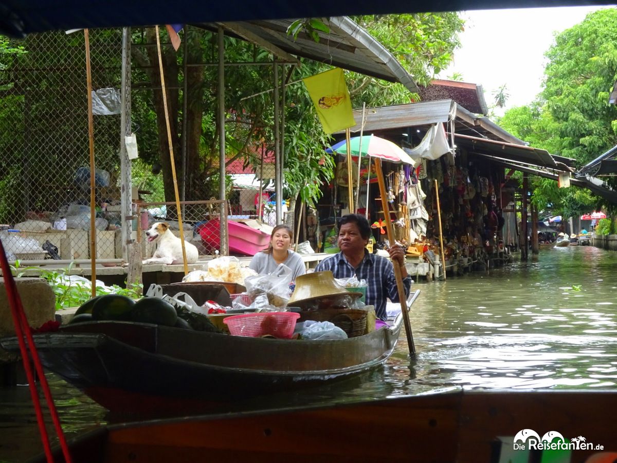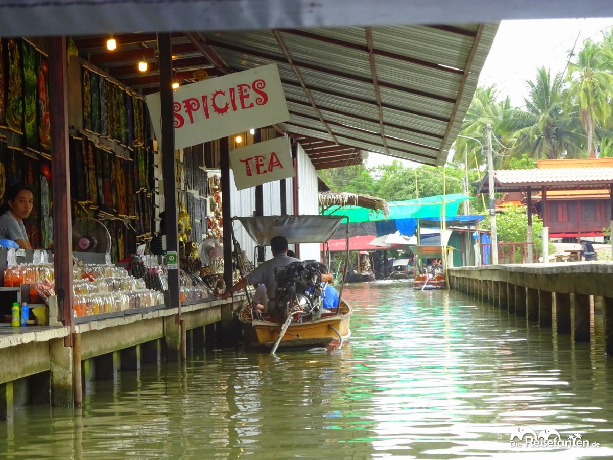 Vom Warenangebot gibt es hier das, was es auch auf allen anderen Märkten gibt. Der Markt ist mittlerweile sehr touristisch geworden. Besonders bemerkbar machte sich dies, als wir am Hauptkanal angekommen sind. Der Kanal war so überfüllt mit Booten, dass diese kaum vorwärts kamen. Hier war es dann auch vorbei mit der ruhigen Fahrt – es war einfach nur voll. Wir waren froh, dass Julie uns an einer ruhigen Stelle ein Boot besorgt hat, hier hätten wir nicht starten wollen bzw wären es wohl auch nicht. So haben wir noch die ruhigen Seiten sehen können, würden aber beim nächsten Mal einen kleineren Markt bevorzugen, der noch nicht so überlaufen ist. Übrigens: die Boote am Hauptkanal sind aufgrund der Nachfrage ungleich teurer. Hier haben wir Schilder gesehen, die 1000 THB aufriefen. Wenn ihr euch den Markt also gerne ansehen möchtet, solltet ihr lieber etwas außerhalb starten.