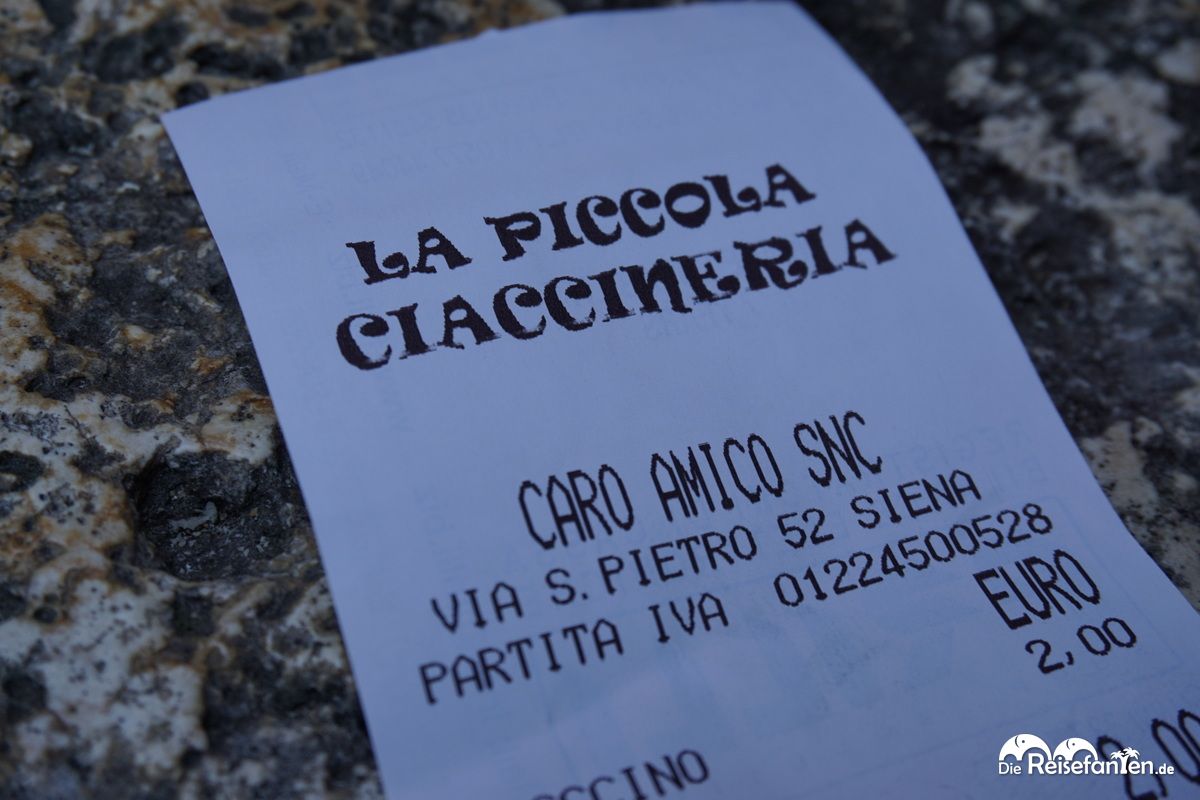 Wir befanden uns in der Nähe des Doms von Siena, der mit schwarzem und weißem Marmor eine außergewöhnliche Optik bietet und schlenderten zurück Richtung unseres Parkplatzes. Ein kurzer Blick auf die umliegenden Empfehlungen (wir suchen meist nach Empfehlungen von Einheimischen) führte uns schließlich zu der unscheinbaren Pizzeria „La Piccola Ciaccineria“ in der Via S. Pietro 52. Diese hat täglich von morgens 10:30 Uhr bis abends 21:30 (sonntags um eine Stunde nach hinten verschoben) geöffnet und serviert leckerste Pizzastücke auf die Hand. Die Preise rangierten dabei lächerlich niedrig für den gebotenen Geschmack und Größe: die Pizza Margherita gibt es für 1.50 € das Stück, am teuersten schlägt die Calzone für 2.50 € zu Buche, was aber auch immer noch sensationell preiswert ist. Wir probierten die klassische Margherita, eine mit Spinat und Käsefüllung und eine klassische Salami-Pizza (mit alter, gereifter Salami) und waren wirklich hin und weg. Von uns eine absolute Empfehlung, zu der wir – wenn wir das nächste Mal in der Nähe sind – unbedingt wieder hingehen werden. Übrigens lässt sich die Pizza dort auch stilvoll genießen – auf der der Pizzeria gegenüberliegenden Steinmauer, die von der toskanischen Sonne auch noch schön warm war.