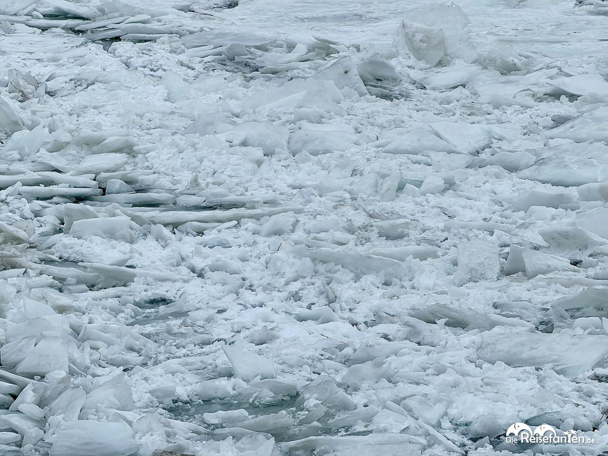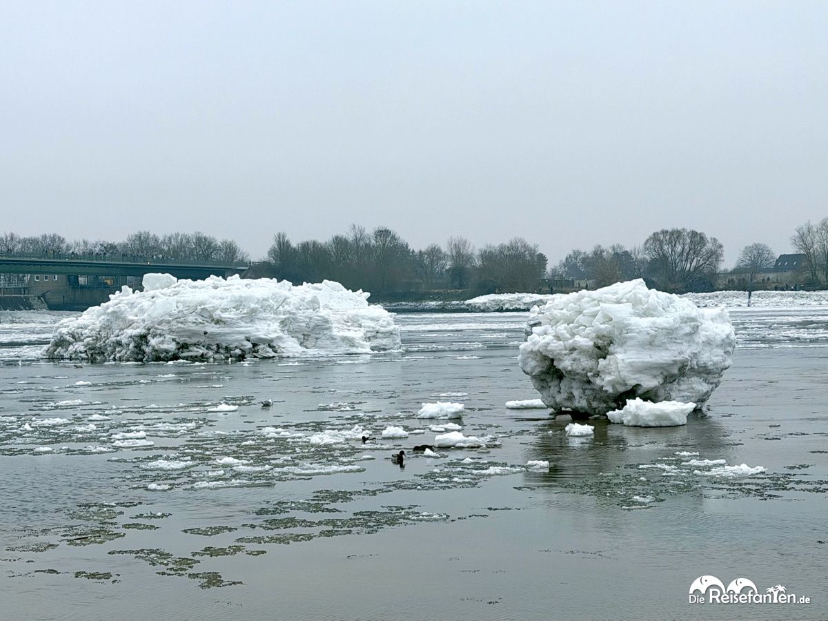 Auch ein Blick vom Wehr auf die Elbe lohnt sich: man nicht nur einen Blick auf die zugefrorene Elbe mit der freigebrochenen Fahrrinne, sondern sieht auch, wie die Eisschollen nach und nach hinunter gleiten. Eine spannende Ergänzung zum Elbstrand und den Eisbergen.