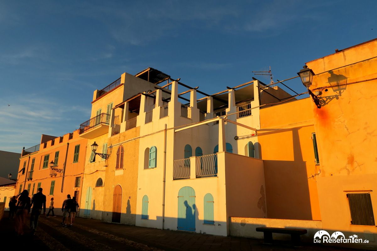 Bevor die Sonne untergehen wollte, fanden wir uns jedoch an der Promenade ein. Die Restaurants und Bars waren schon gut gefüllt und die Sundowner standen auf den Tischen. Wir suchten uns hingegen einen Platz auf der Stadtmauer. Kurz bevor die Sonne unterging ist die Zeit, in der man das Beste Licht für tolle Fotos von der Altstadt Algheros hat. Seht selbst: