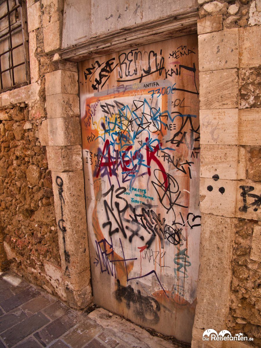 Vom Hafenbecken aus liefen wir nach Süden zur Sankt Nikolaus Kirche, einer historischen Klosterkirche die sogar teilweise mal Militärkaserne und Moschee war. Doch der Weg dahin gestaltete sich als etwas abenteuerlich: auf der einen Seite gab es malerische Gassen, auf der anderen Seite jedoch viel Graffiti (das sind wir ja schon von diversen Ecken Griechenlands gewohnt), kaputte Gebäude und überhaupt ein eher unfreundliches Straßenbild.