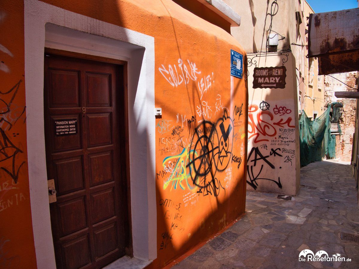 Vom Hafenbecken aus liefen wir nach Süden zur Sankt Nikolaus Kirche, einer historischen Klosterkirche die sogar teilweise mal Militärkaserne und Moschee war. Doch der Weg dahin gestaltete sich als etwas abenteuerlich: auf der einen Seite gab es malerische Gassen, auf der anderen Seite jedoch viel Graffiti (das sind wir ja schon von diversen Ecken Griechenlands gewohnt), kaputte Gebäude und überhaupt ein eher unfreundliches Straßenbild.