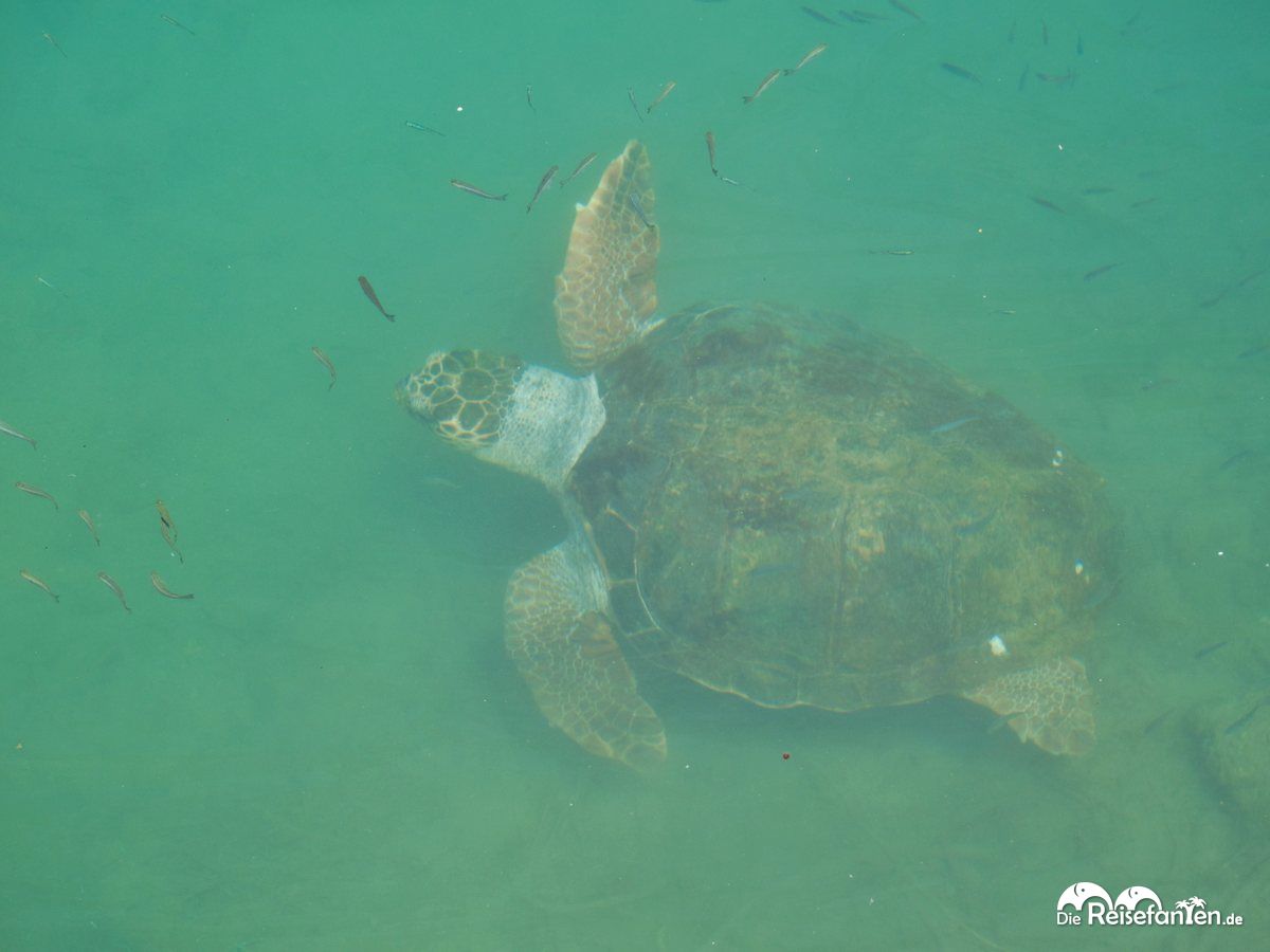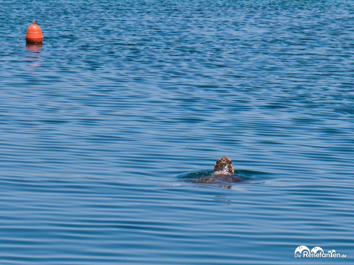 Mit kühlem Wasser versorgt hielt das schöne Hafenbecken dann auch noch eine ganz besondere Überraschung für uns bereit: wir entdeckten eine große Wasserschildkröte, die im Hafenbecken umherschwamm und offenbar sehr zutraulich war. Sie zog direkt auch das Interesse anderer Besucher auf sich und zog gemütlich im Hafenbecken ihre Kreise zwischen Booten und kleinen Fischschwärmen.