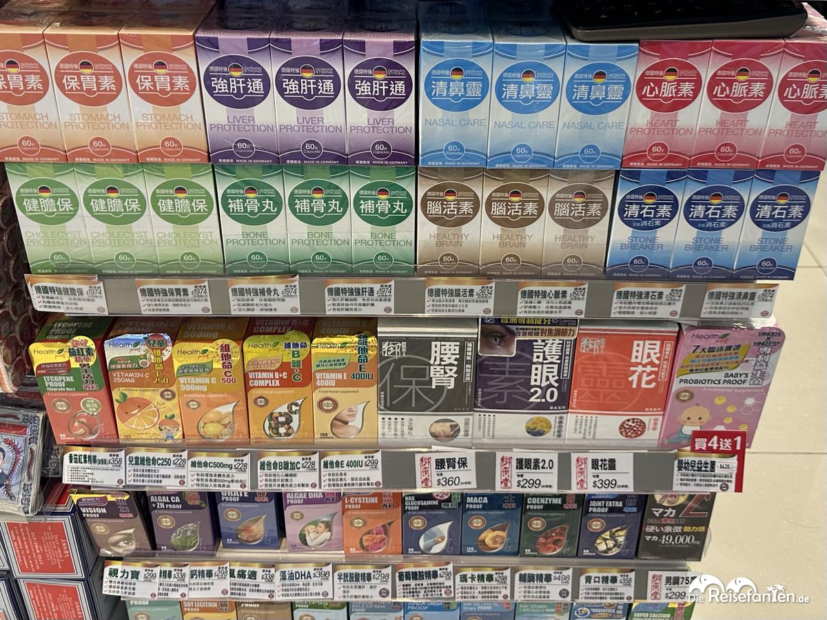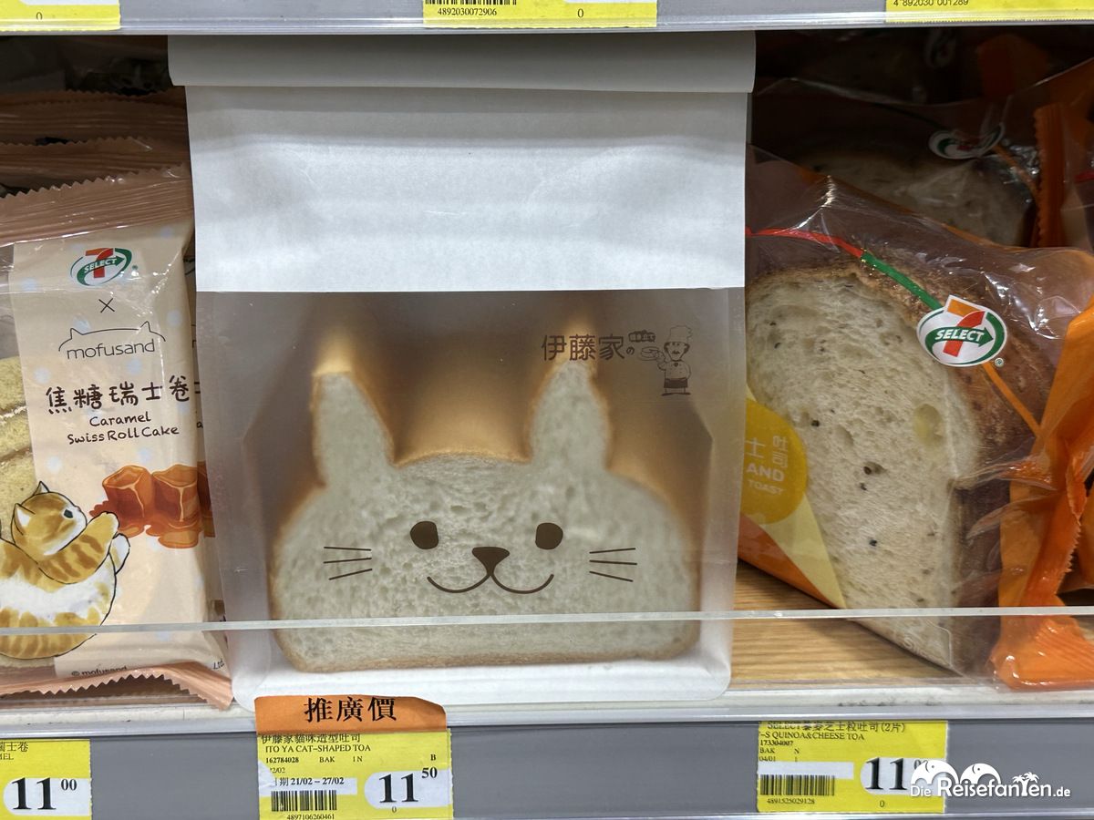 Auf unserer Ankunftsebene war das Restaurant- und Geschäftsangebote begrenzt, dennoch fanden wir in einem Shop interessante Köstlichkeiten: Toast in Katzenform, Fischhaut als Snack und allerlei Wundermittel aus Deutschland – spannend. 🙂