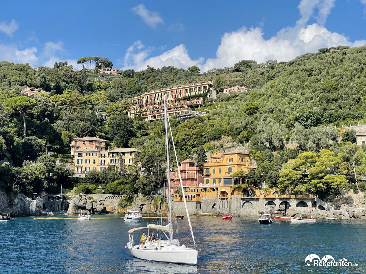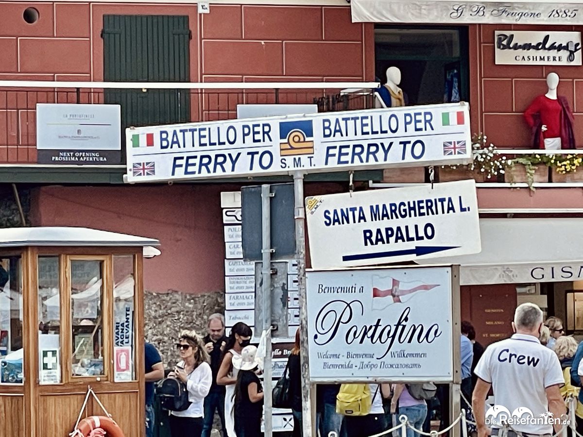 Mit dem Auto hat man keine Chance Portofino zu erreichen. Wer gut zu Fuß ist, kann von Santa Margherita Ligure aus eine Wanderung unternehmen oder man nimmt eines der Ausflugsboote. Eine Fahrt nach Portofino dauert nicht lang und ist sehr beliebt. Man sollte daher rechtzeitig vor dem Ablegen da sein, damit man noch einen Platz bekommt. Wir haben den hinteren Teil der Boote bevorzugt, da man dort draußen sitzen und schöne Fotos einfangen kann.