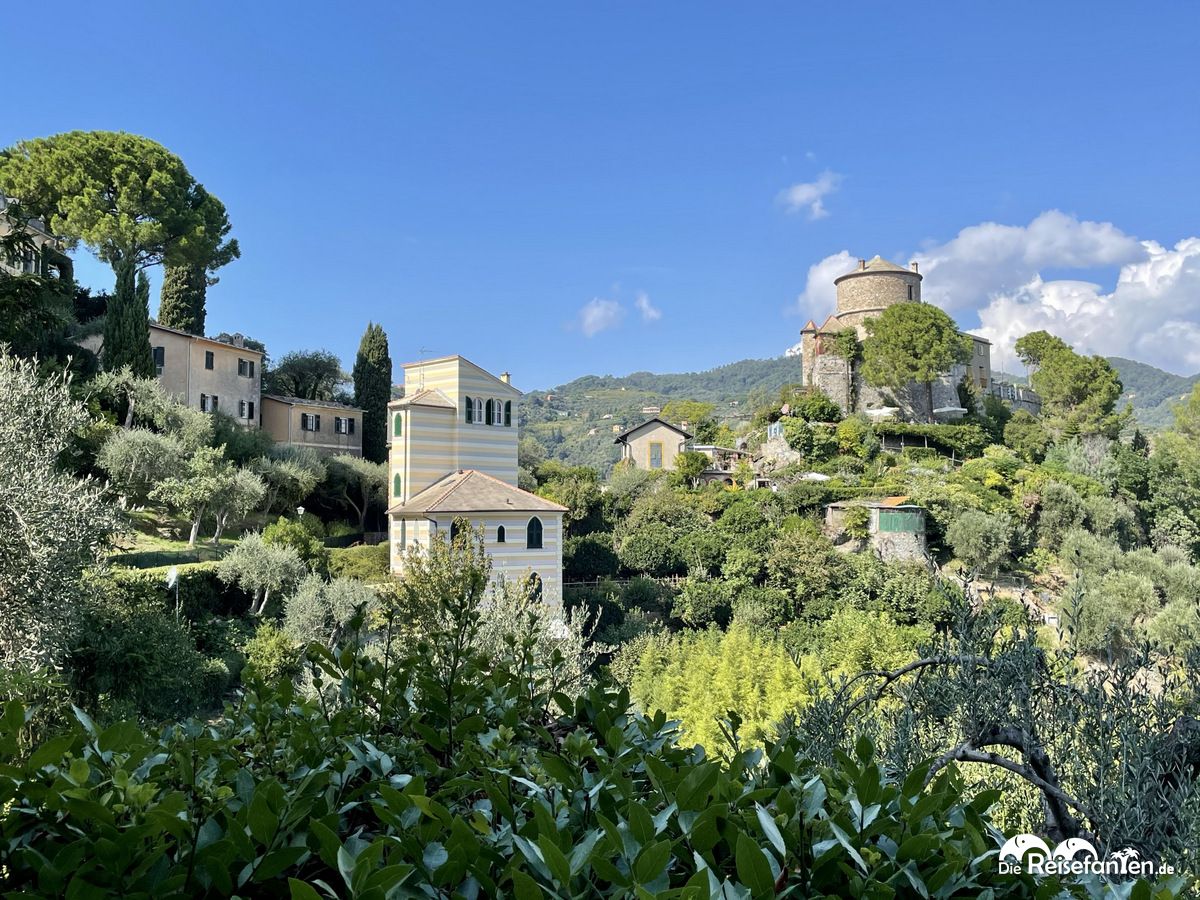Wir verschafften uns einen kurzen Überblick und machten dann einen Spaziergang zum Leuchtturm. Dabei kamen wir an einigen Villen vorbei, die mal mehr mal weniger blickgeschützt waren. Hier war es aber vor allem sehr grün. Der Fußweg zum Leuchtturm war angenehm und von uns immer wieder für Fotos unterbrochen. Da der Weg höher gelegen war, hatte man auf dem Rückweg auch einen schönen Blick auf die Bucht von Portofino.