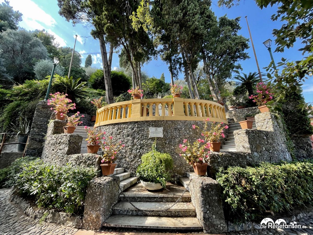 Portofino LogoWir verschafften uns einen kurzen Überblick und machten dann einen Spaziergang zum Leuchtturm. Dabei kamen wir an einigen Villen vorbei, die mal mehr mal weniger blickgeschützt waren. Hier war es aber vor allem sehr grün. Der Fußweg zum Leuchtturm war angenehm und von uns immer wieder für Fotos unterbrochen. Da der Weg höher gelegen war, hatte man auf dem Rückweg auch einen schönen Blick auf die Bucht von Portofino.