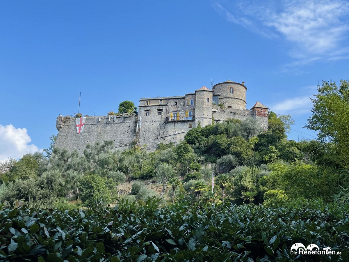 Portofino LogoWir verschafften uns einen kurzen Überblick und machten dann einen Spaziergang zum Leuchtturm. Dabei kamen wir an einigen Villen vorbei, die mal mehr mal weniger blickgeschützt waren. Hier war es aber vor allem sehr grün. Der Fußweg zum Leuchtturm war angenehm und von uns immer wieder für Fotos unterbrochen. Da der Weg höher gelegen war, hatte man auf dem Rückweg auch einen schönen Blick auf die Bucht von Portofino.