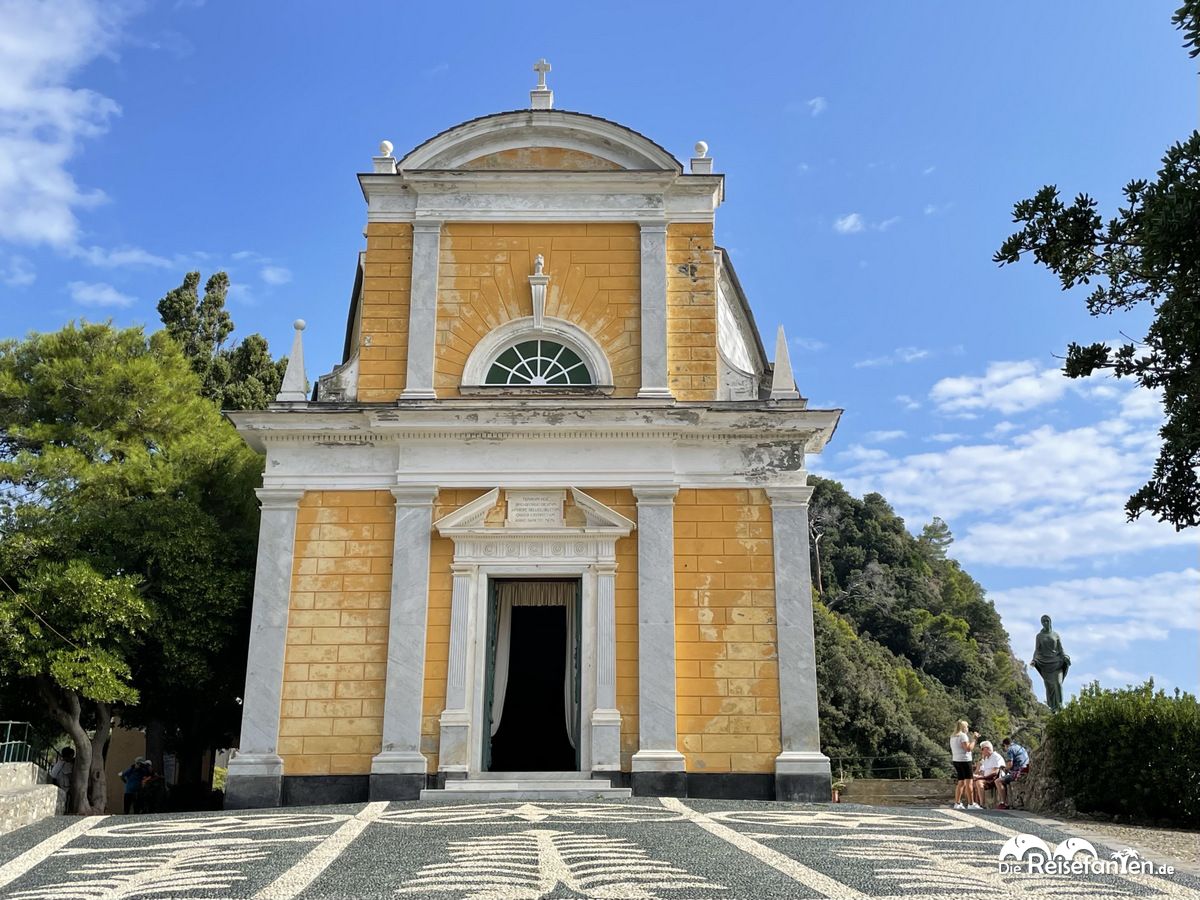 Zurück vom Leuchtturm kamen wir an einer Kirche vorbei und schauten uns anschließend im Ort um. Die Restaurants werben mit den prominenten Gästen, die dort einkehrten und rufen entsprechende Preise auf. Rund um den zentralen Platz von Portofino war es recht trubelig aber in den Seitengassen war es direkt entspannter. Dort findet man auch Eisdielen und Souvenirstände zu normalen Preisen, in direkter Nachbarschaft sind dann die Designerläden angesiedelt. Es sollte also jede/r irgendwie fündig werden. 🙂
