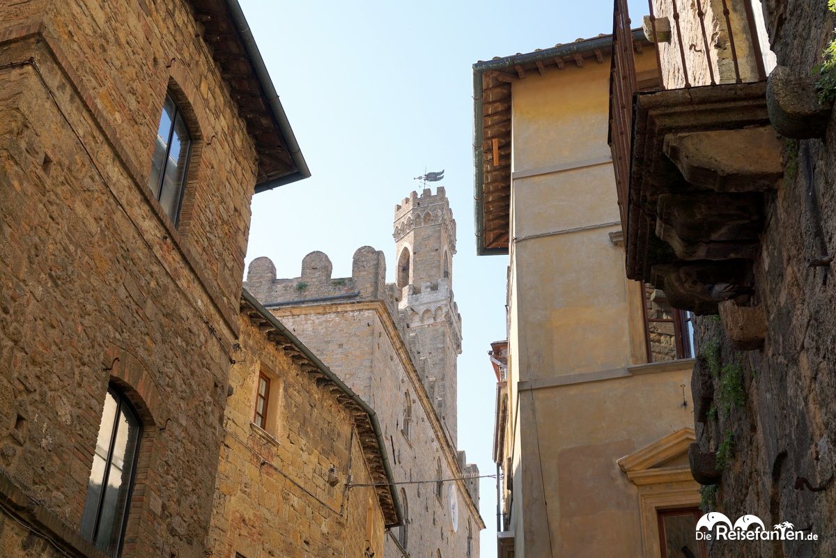 Parkhaus an der Einfahrt zu VolterraWir parkten unser Auto vor den Toren der Kernstadt in einem Parkhaus (1 € die halbe Stunde, 15 € Tageshöchstsatz) und erkundeten die Straßen und Gassen Volterras zur frühen Mittagszeit. Ein Stück Pizza vor dem „Palazzo dei Priori“ (nebenbei der älteste Kommunalpalast der Toskana) ist alleine schon aufgrund der tollen Kulisse zu empfehlen, ebenso das wohl leckerste Minz-Eis, das wir jemals hatten, durften wir in Volterra probieren. Zu den empfehlenswerten Sehenswürdigkeiten zählen noch die Kathedrale, das Porta all’Arco oder das römische Theater.