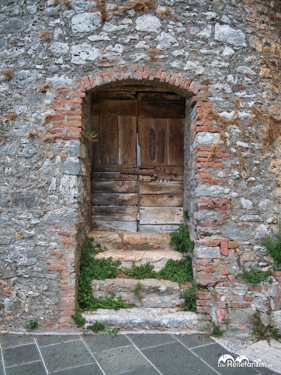 Von dort aus ging es durch ein brutalistisch anmutendes Treppenhaus hoch zum großen Stadttor, das zur Piazza Matteotti führt. Von dort aus begannen wir unsere Erkundungstour durch die engen und teils steilen Gassen. Wir entdeckten dort alte italienische Geschäfte, mit Blumenkästen geschmückte Türen, abenteuerliche Außentreppen, mittelalterliche Tore, einen alten Fußballplatz, fragil wirkende Balkone und eher nichtssagende Klingelschilder. Kurzum, unser kleiner Spaziergang hat uns sehr gut gefallen – viel los war in der Altstadt jedoch nicht, was aber auch an unserer Besuchzeits kurz vor Mittag gelegen haben kann. Ein paar Einheimische sind uns begegnet, wir grüßten uns freundlich, aber wer eine große Einkaufstour machen möchte, wird im alten Teil Rapolanos vermutlich nicht glücklich. Wir fanden die Eindrücke in diesem kleinen italienischen Städtchen aber sehr schön und genossen den kurzen Aufenthalt dort.