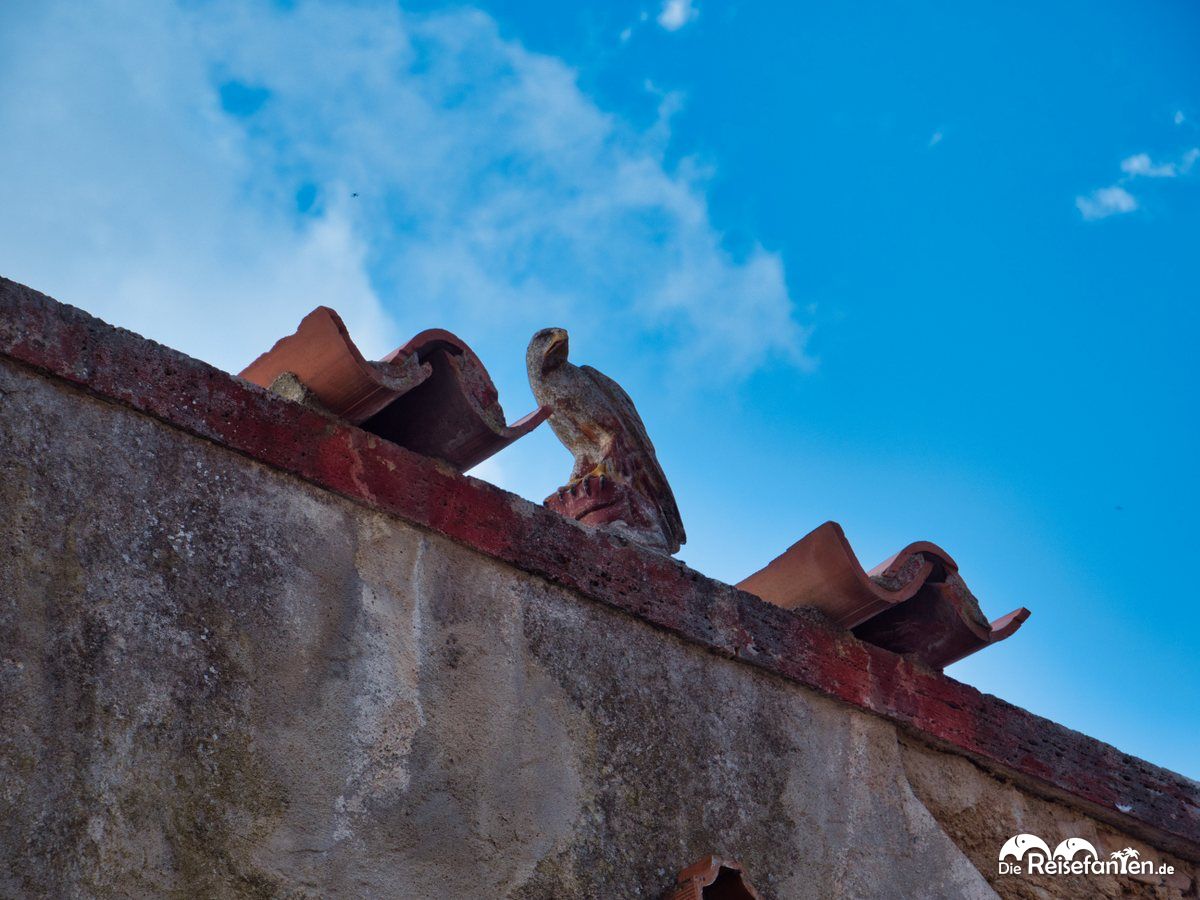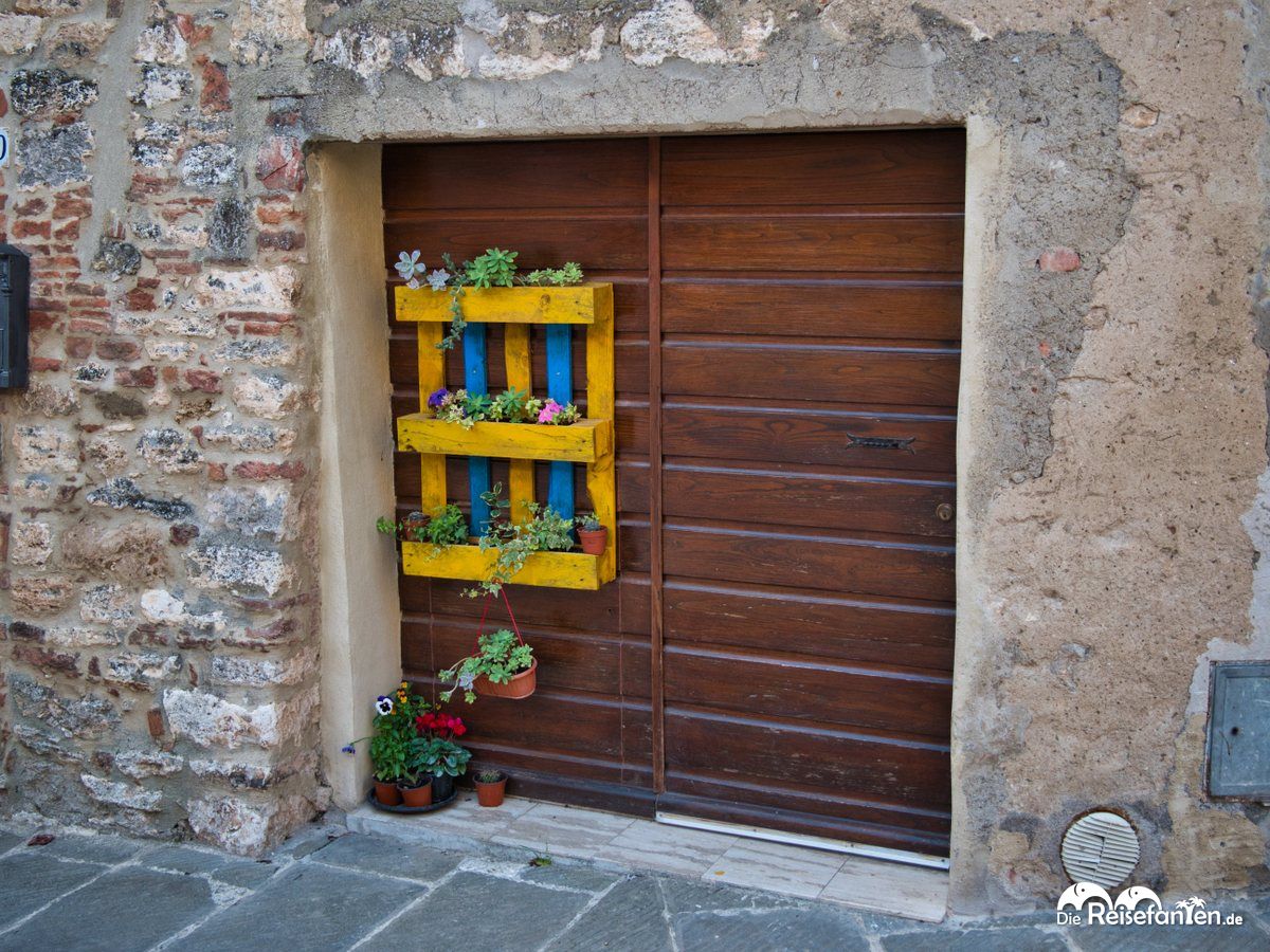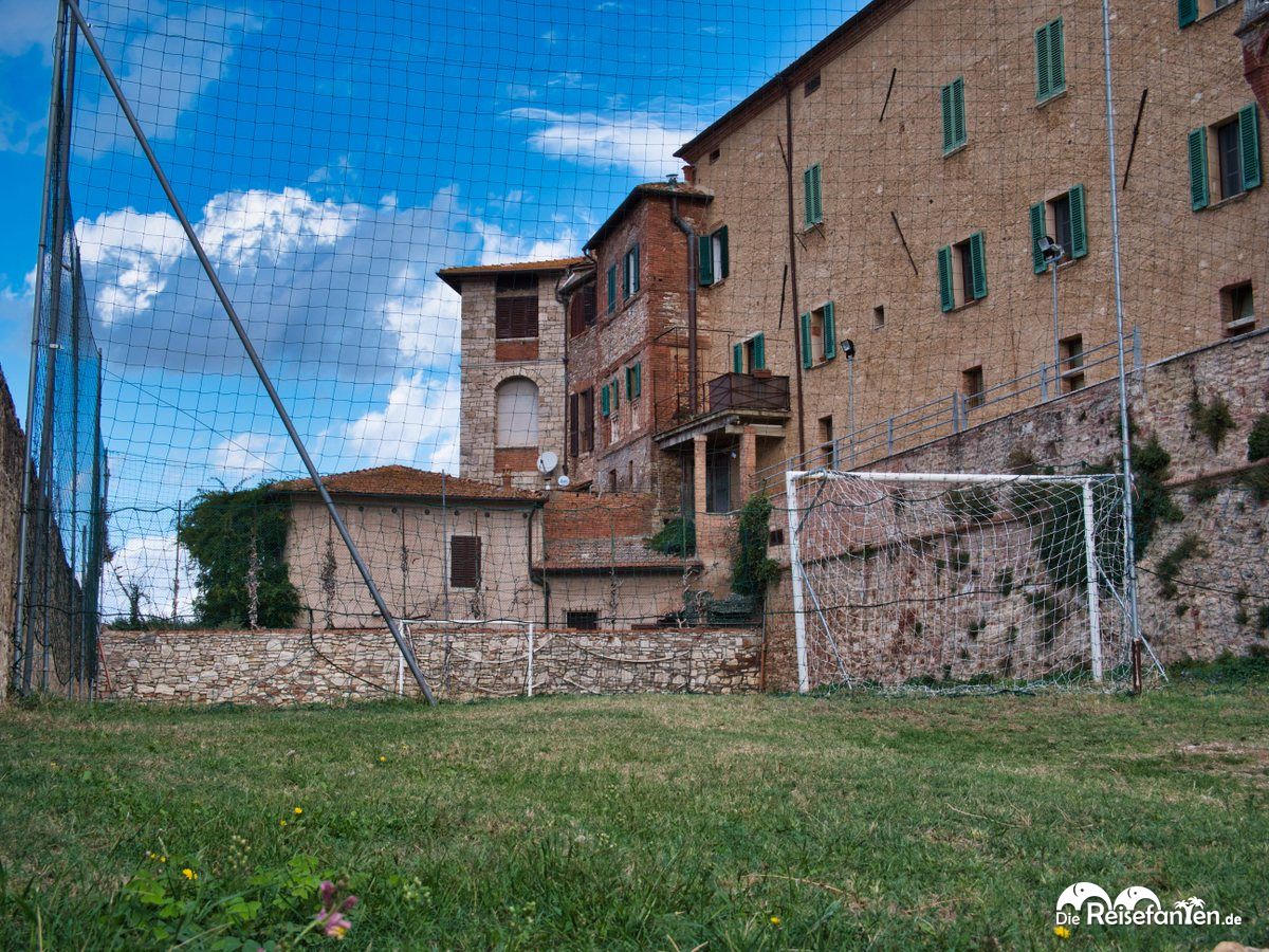 Von dort aus ging es durch ein brutalistisch anmutendes Treppenhaus hoch zum großen Stadttor, das zur Piazza Matteotti führt. Von dort aus begannen wir unsere Erkundungstour durch die engen und teils steilen Gassen. Wir entdeckten dort alte italienische Geschäfte, mit Blumenkästen geschmückte Türen, abenteuerliche Außentreppen, mittelalterliche Tore, einen alten Fußballplatz, fragil wirkende Balkone und eher nichtssagende Klingelschilder. Kurzum, unser kleiner Spaziergang hat uns sehr gut gefallen – viel los war in der Altstadt jedoch nicht, was aber auch an unserer Besuchzeits kurz vor Mittag gelegen haben kann. Ein paar Einheimische sind uns begegnet, wir grüßten uns freundlich, aber wer eine große Einkaufstour machen möchte, wird im alten Teil Rapolanos vermutlich nicht glücklich. Wir fanden die Eindrücke in diesem kleinen italienischen Städtchen aber sehr schön und genossen den kurzen Aufenthalt dort.