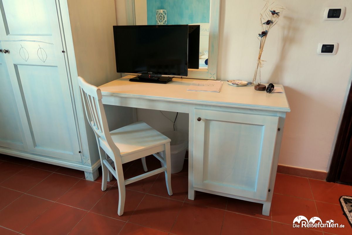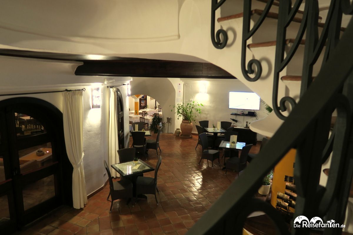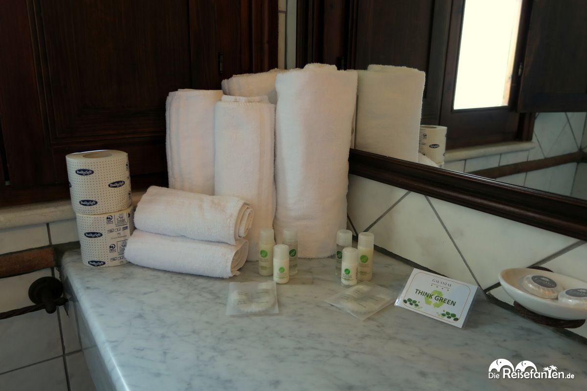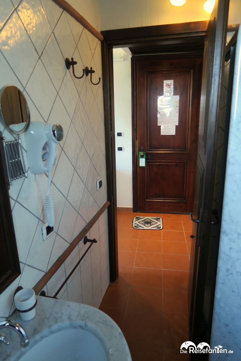 Das türkis gestrichene Zimner hat uns auf Anhieb sehr gut gefallen. Türkis ist übrigens meine Lieblingsfarbe – der Hotelaufenthalt stand also unter einem sehr guten Stern. 😉 Das Zimmer war mediterran, romantisch und verspielt zugleich. Ausgestattet sind alle Zimmer mit Flachbildfernsehern und einem Safe und für eine gute Nacht sorgte ein bequemes Doppelbett. Besonders positiv in Erinnerung geblieben ist uns das Kopfkissen, welches aufgrund der Füllung außerordentlich bequem war. Eine erholsame Nacht ist dadurch praktisch garantiert – lediglich etwas hellhörig war es in unserem Zimmer. Im Badezimmer, welches zwar nicht ganz so modern war aber dennoch zum Stil der Anlage passte, standen Pflegeprodukte bereit.