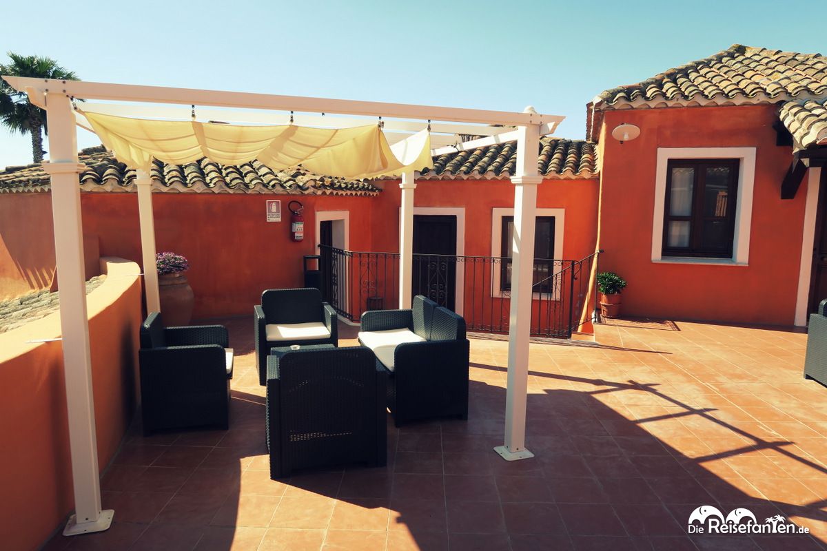 Inmitten eines großen mediterranen Gartens befindet sich das Haupthaus sowie zwei große Pools mit Sonnenliegen. Wir wurden an der Rezeption freundlich begrüßt und bekamen nach einer kleinen Hotelführung unser Zimmer Nummer 5 im Hauptgebäude gezeigt. Schon jetzt fielen uns die vielen kleinen Sitzecken im gesamten Hotelbereich auf, die allen Hotelgästen zur Verfügung stehen und so auch bei einer Reise in der Gruppe eine schöne Rückzugsmöglichkeit bieten.