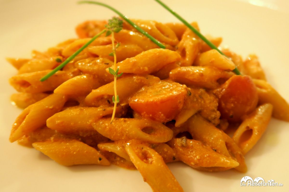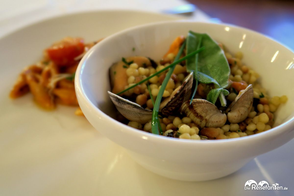 Das Abendessen findet täglich von 19.30h bis 21.30h im Hotelrestaurant im Erdgeschoss des Hauptgebäudes statt und wir freuten uns schon auf einen kulinarischen Abend bei einem Gläschen Wein. Zunächst gab es ein kaltes Antipasti-Buffet mit vielen Köstlichkeiten. Anschließend folgte der am Platz servierte 2. und 3. Gang. Auf der täglich wechselnden Speisekarte wurden jeweils 2 Gerichte für den 2. und 3. Gang angekündigt und diese wurden auch jeweils beide serviert. Dabei handelte es sich bei einem Gericht jeweils um ein Seafoodgericht. Natürlich gab es aber auch die Möglichkeit dieses abzuwählen und vegetarische Gerichte waren auf Wunsch ebenfalls verfügbar. Die netten Kellner boten den Gästen nach jedem Gang noch einen Nachschlag an – bei der leckeren Pasta sagten auch wir nicht nein. Hungrig ist hier somit keiner geblieben, zumal es zum Abschluss auch noch ein Dessert gab. Übrigens gab es zum Abendessen eine umfangreiche und recht günstige Weinkarte mit leckeren Weinen von der Insel, ein paar Infos zu den Anbaugebieten inklusive. Und damit nicht genug: jeden Mittwoch wird im Hotel ein sardischer Abend mit vielen lokalen Gerichten und Folklore veranstaltet.