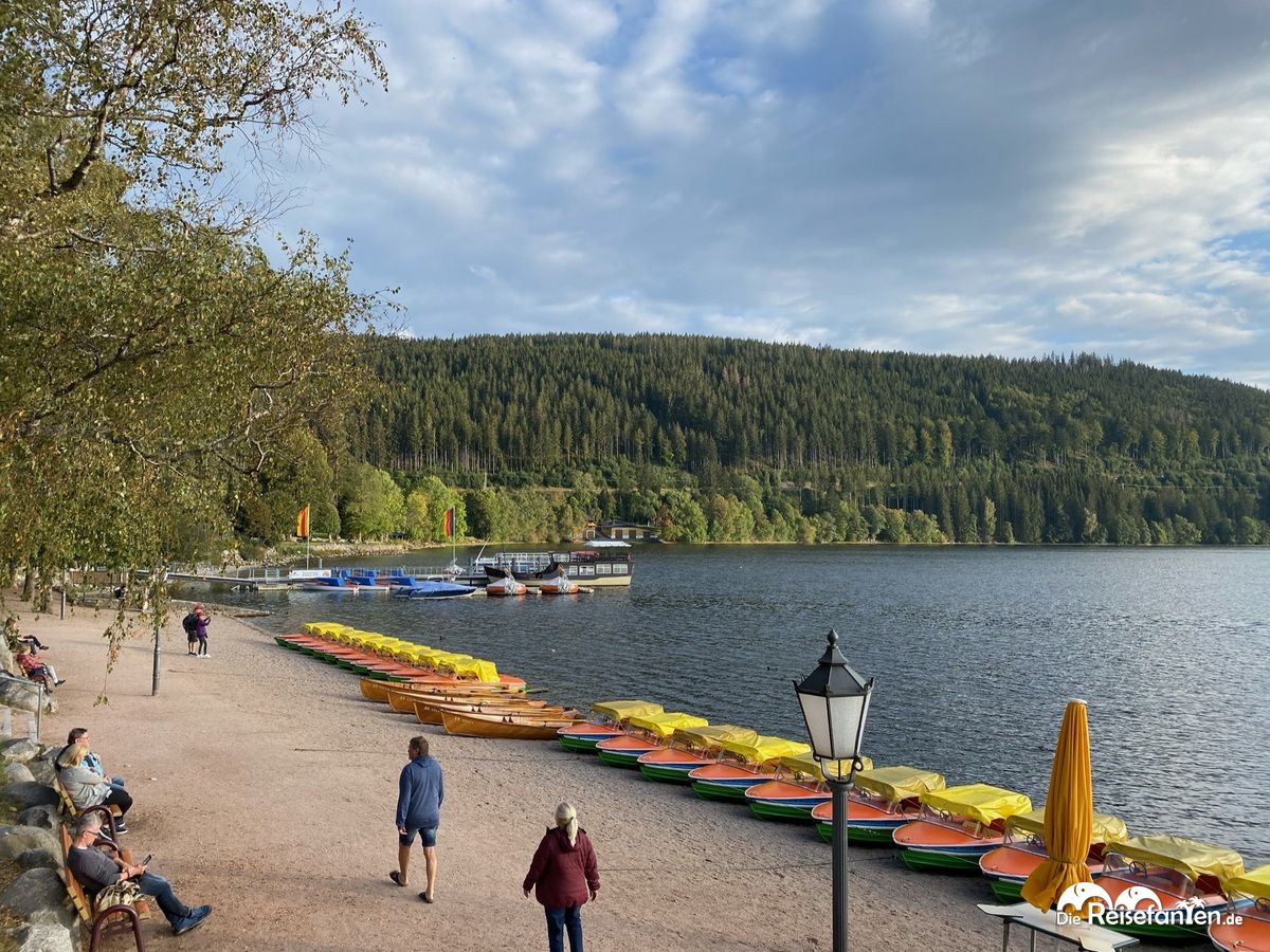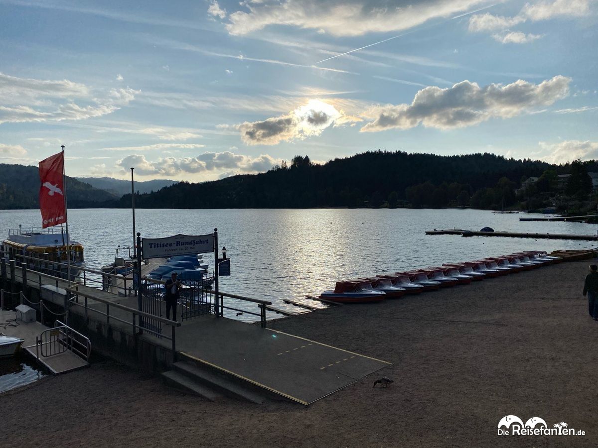 Am Ende der Fußgängerzone beginnt direkt das Seeufer. Auf dem Titisee gibt es kleine Rundfahrten und wer lieber selber aktiv ist, der findet dort kleine Ruder- und Tretboote. Aber auch für die Boote war der Tag schon beendet, sie warteten bereits auf den nächsten Tag. Einige Urlauber genossen noch die letzten Sonnenstrahlen am See und wir bewunderten das schöne Panorama.