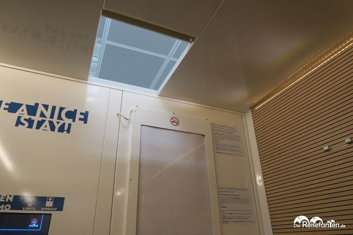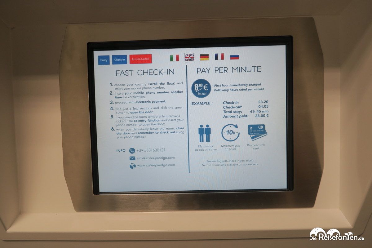 Die nötige Müdigkeit und freie Kabinen vorausgesetzt (es gibt dort nur drei an der Zahl), schauten wir uns das also einmal genau an. Das Bedienterminal außerhalb der Kabinen klärt über die Konditionen auf. 8 € kostet pauschal die erste Stunde, danach wird im fairen Minutentakt abgerechnet. Bezahlen lässt sich mit Kreditkarte, maximal zwei Personen dürfen gleichzeitig rein (mehr finden dort auch keinen Platz) und bis zu 10 Stunden lang darf der Aufenthalt sein. Neben einer Kreditkarte braucht man noch ein Mobiltelefon, um sich zu authentifizieren oder falls man einmal kurz raus möchte, die Kabine aber nicht verlieren will.