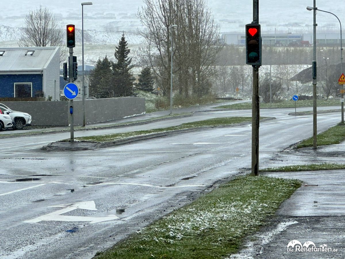 Unser Weg führte uns weiter durch die Straßen und durch die Wohngebiete. Die Häuser wirkten zum Großteil sehr gepflegt, es gab kaum Graffiti. In den Gärten blühten jetzt noch (oder schon?) die Osterglocken. Es schneite noch immer und der Schnee kam aus allen Richtungen und flog uns direkt ins Gesicht, was ganz schön kalt war. Zumindest für unser Empfinden, die lokale Jugend war mit Hoddie scheinbar zufrieden. Die Ampeln sind hier übrigens mit Herzen versehen – dem Autofahrer erscheint ein rotes Herz als Rotzeichen.