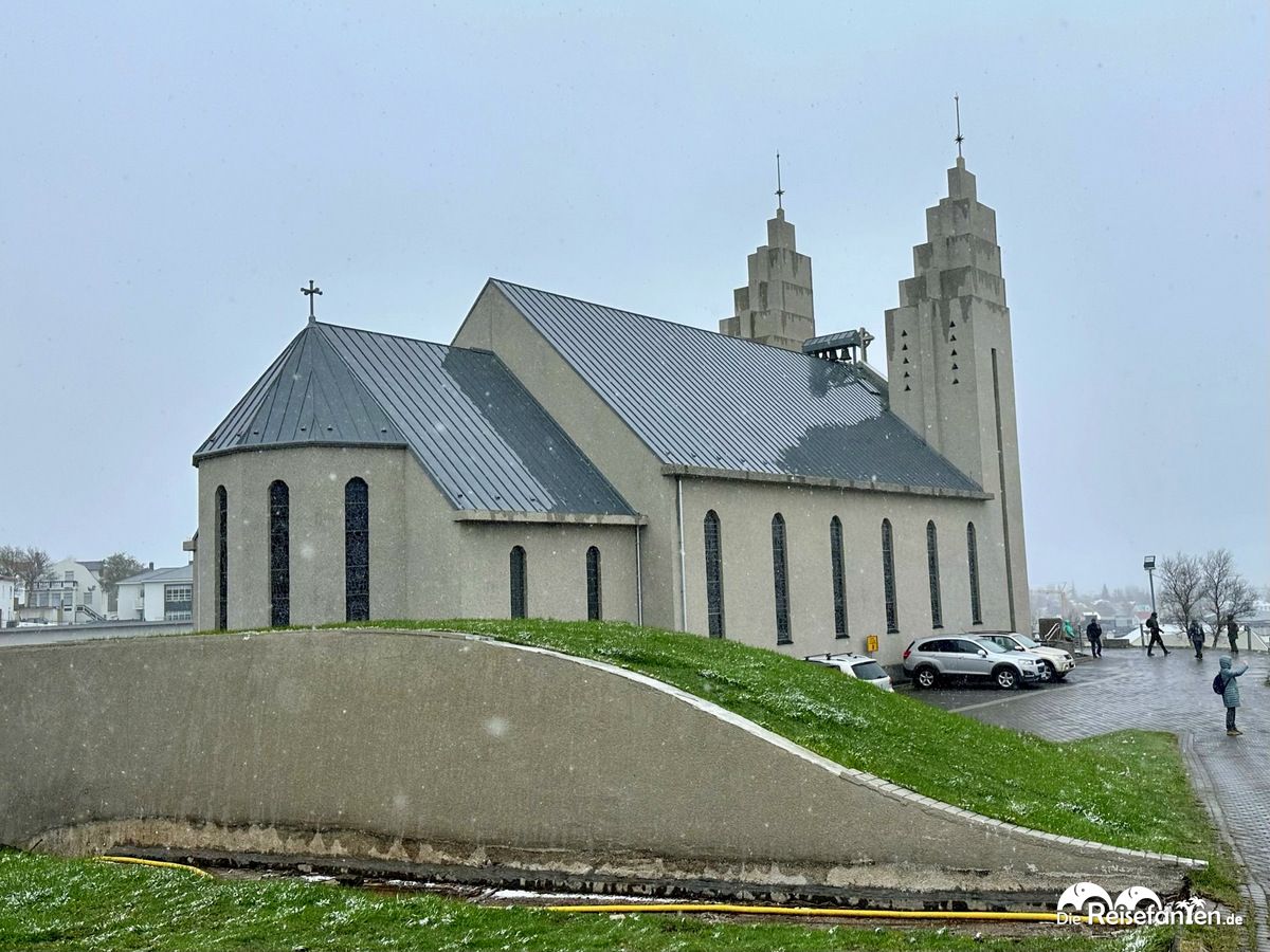 Akureyrarkirkja oder die Kirche von Akureyri ist das Wahrzeichen der Stadt. Die Kirche ist über Treppen zu erreichen und thront förmlich über dem Fjord und dem Stadtzentrum. Aufgrund des Wetters hatten wir bei unserem Besuch leider kaum Sicht, die Aussicht bei gutem Wetter wohl ganz schön sein. Dennoch lohnte sich der Weg hierher, wenngleich die Kirche geschlossen und nur von außen besichtigt werden konnte. Eingeweiht wurde die Kirche im Jahr 1940. Entworfen hat sie Gudjon Sumuelsson, der ebenfalls die berühmte Hallgrimskirkja in Reykjavik entworfen hat. Die Ähnlichkeit ist also nicht von ungefähr.