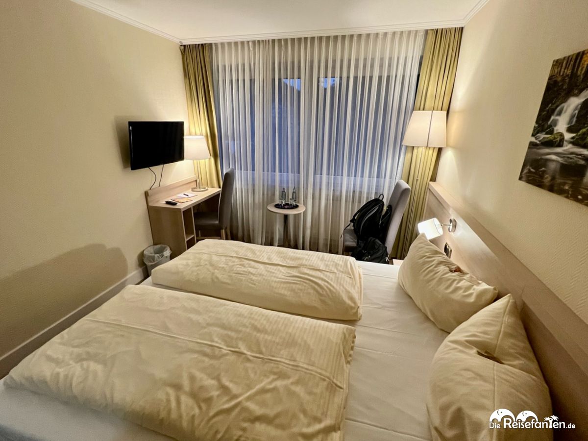 Doppelbett im Parkhotel Bad HarzburgDas Zimmer waren renoviert, wenn man vom Badezimmer absieht, das war optisch noch aus den 70ern und leider auch nicht ganz so sauber. Das Bett hingegen war frisch und bequem zudem. Insgesamt ist das Gebäude sehr hellhörig, man kann die Nachbarn gut hören und so gehörten Oropax dazu, um am nächsten Morgen nicht von den Frühaufstehern geweckt zu werden. Positiv empfanden wir die zwei Wasserflaschen, die im Zimmer bereit gestellt wurden. Im Empfangsbereich hätte es zudem auch noch Getränkeautomaten gegeben.