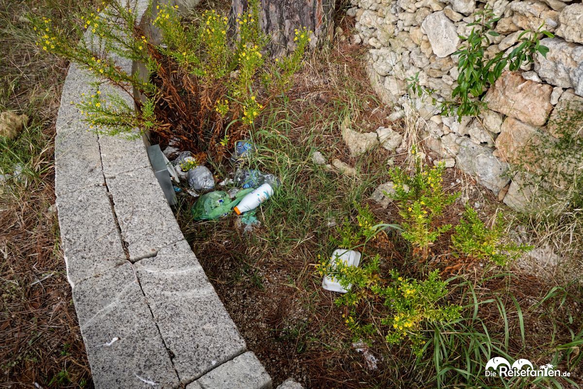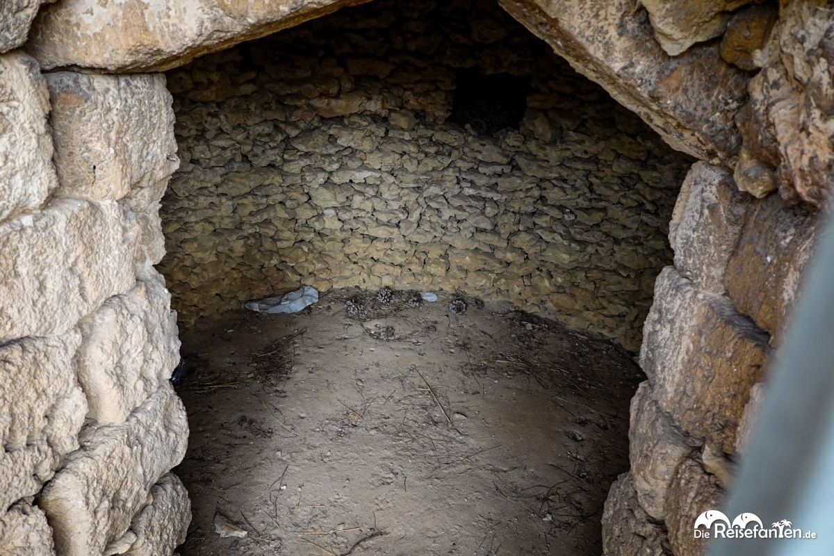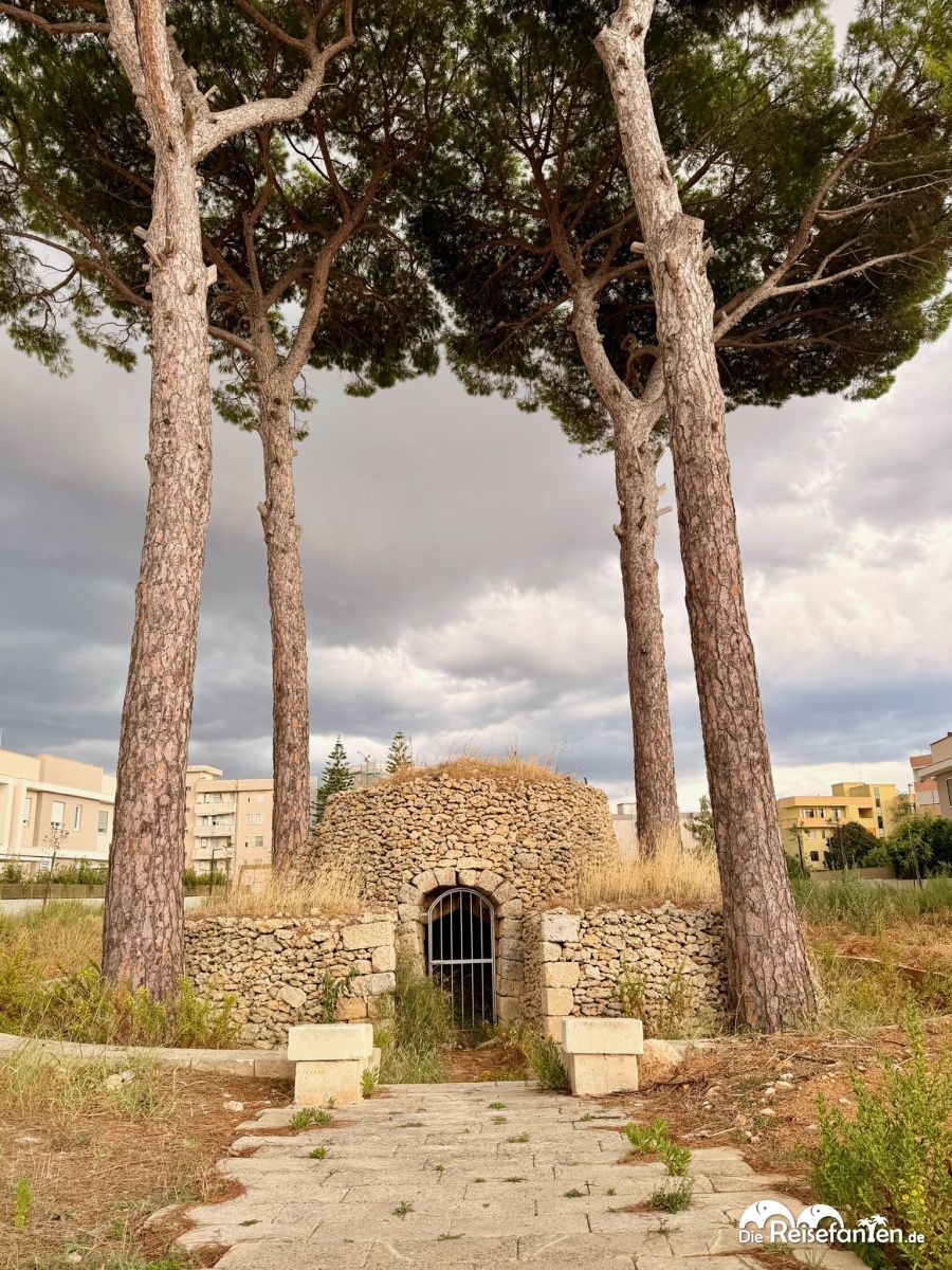 Kaum betraten wir den kleinen Park, zog es uns zum kegelförmigen Bau aus lokaler Trockenmauer (pietra leccese) mit spitzbogiger Öffnung. Umgeben von Pinien und etwas Wildwuchs lud er aufgrund des vielen Mülls leider nur bedingt zum Verweilen ein. Die Gittertür schützte immerhin den Innenraum, der vielleicht als Grill- oder Backofen diente – typisch für Süditaliens Masserien-Kultur.